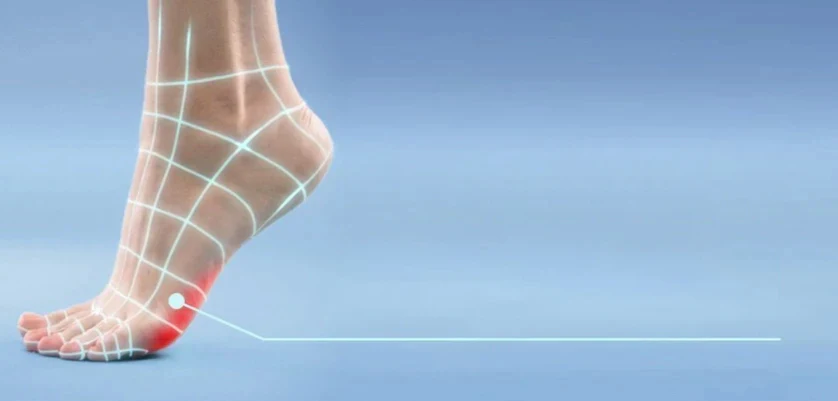 Metatarsalgia is the name given to pain in the ball of the foot. The pain affects the area underneath the metatarsal bones at the front of the foot and is a common point of pain as this is where most weight is distributed when standing, walking and running.