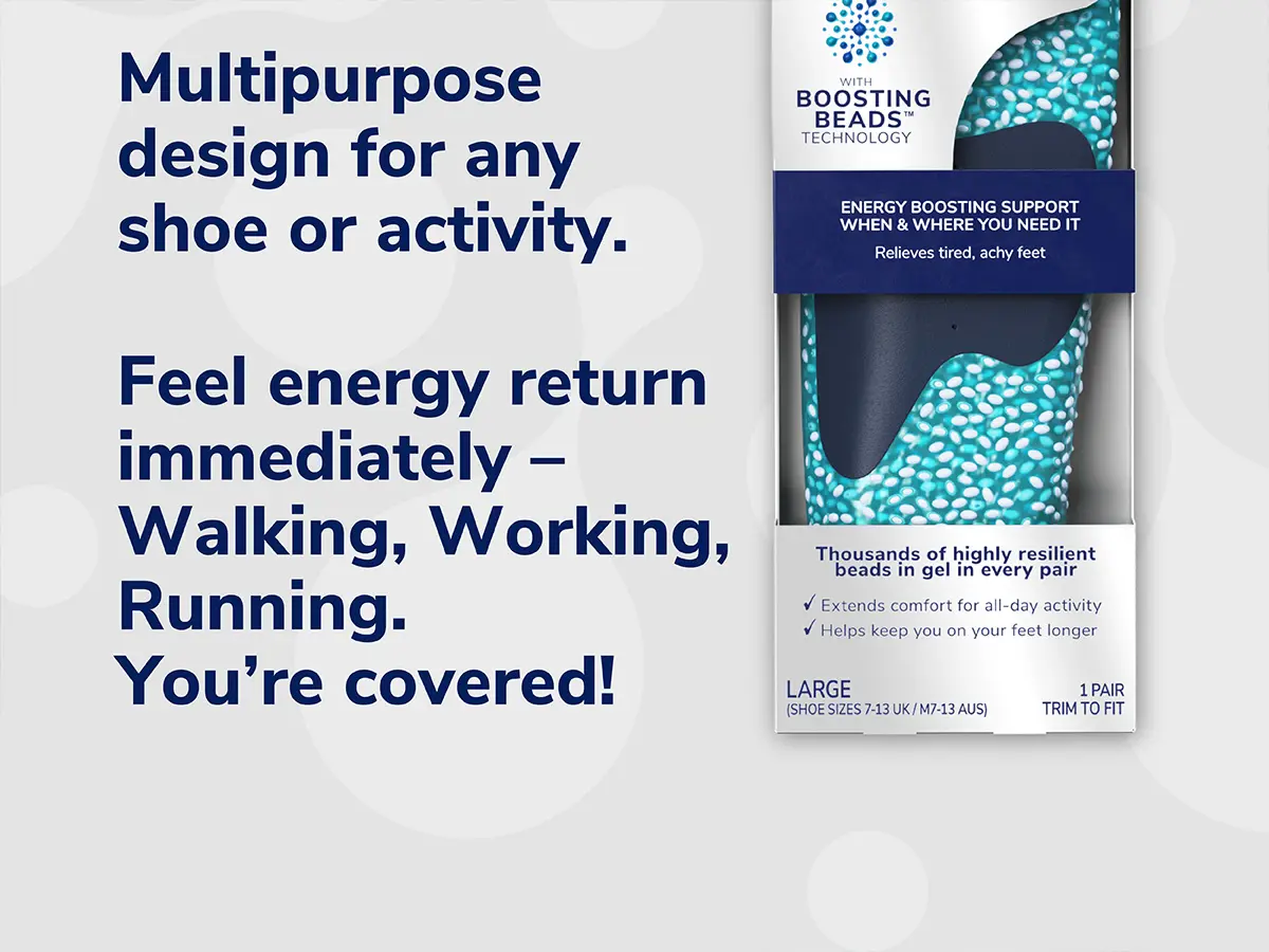 Dr. Scholl’s 24-Hour Energy Multipurpose Insoles are designed to keep you energised and moving all day long. Offering clinically proven energy-boosting support, these insoles provide a boost with every step, helping you do what you love for longer. The insoles deliver immediate relief from fatigue, reducing tired, achy feet and helping you feel refreshed. Thousands of foam beads combined with memory foam cushioning contour to your foot, providing added support and energy return. Suitable for any shoe or activity, they are flawless for walking, working, or running. Designed for all-day comfort, they help you stay on your feet longer with energising support.