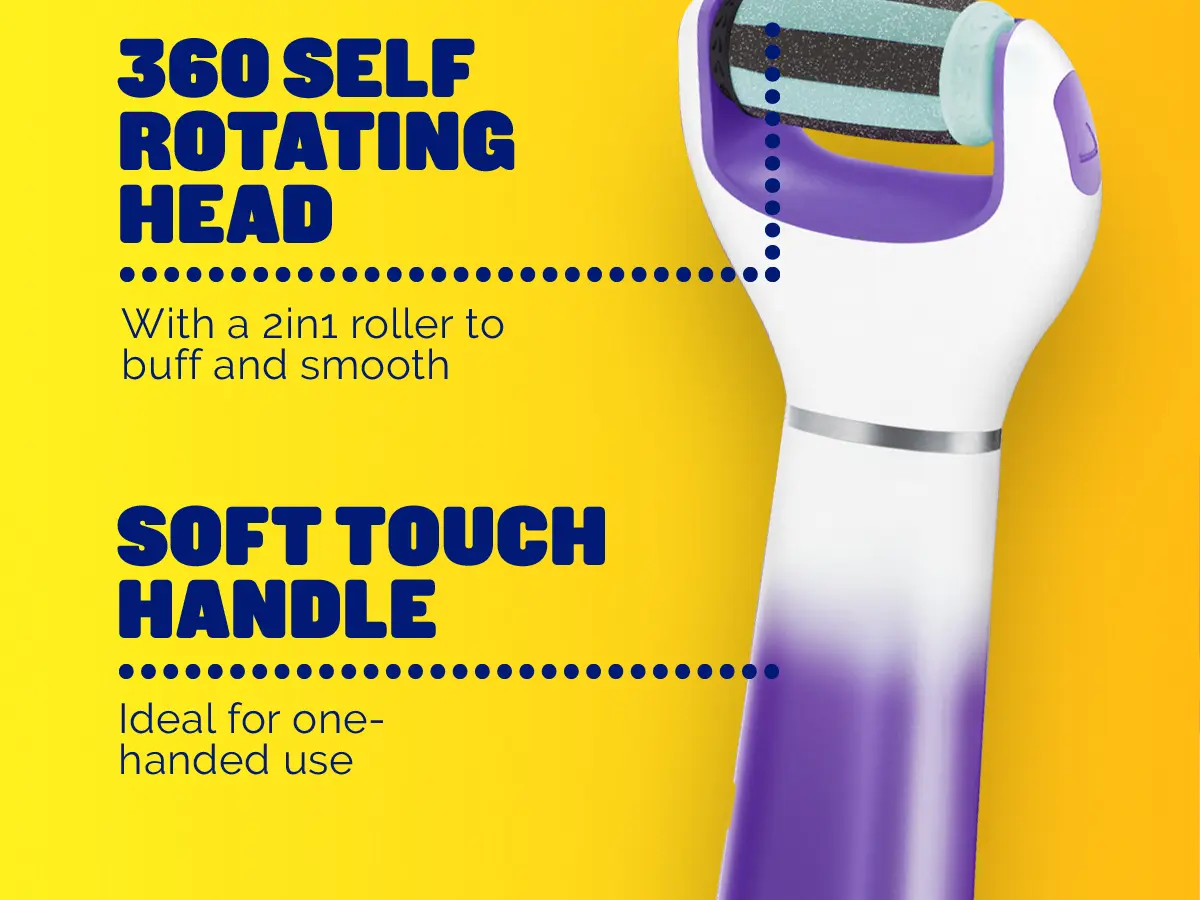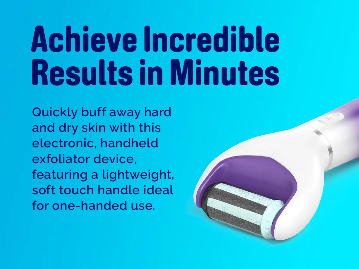 SUPERIOR HARD SKIN REMOVAL: Achieve silky-smooth feet in minutes with the Scholl Expert Care Electronic Foot File System. Easily buff away hard and dry skin with this handheld exfoliator featuring a soft-touch handle and ergonomically designed grip. Available in purple.
