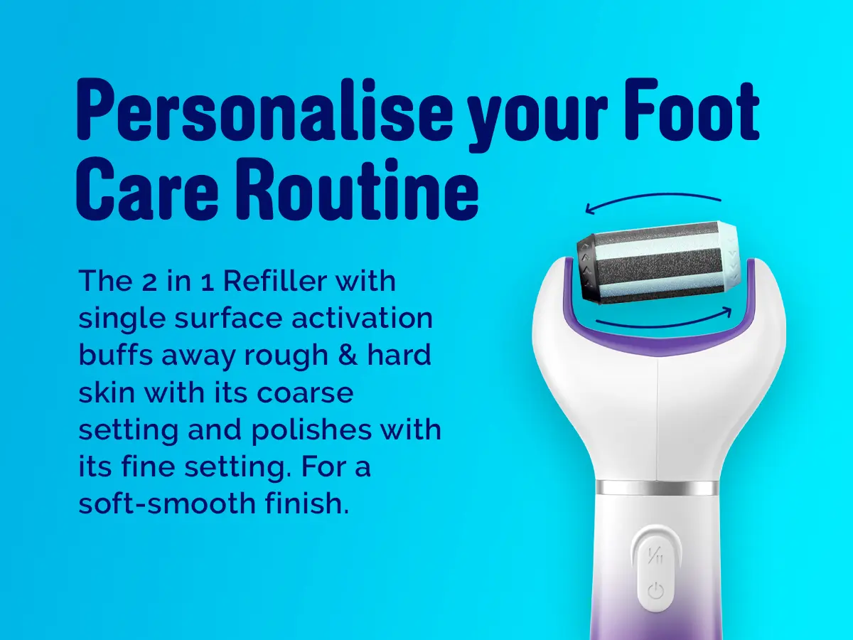Indulge in superior foot care with the Scholl Expert Care Electronic Foot File System. Achieve velvety-smooth feet in minutes with this ergonomically designed, purple exfoliator. The self-rotating head, with dual-speed settings, effortlessly removes hard and dry skin, promising a pain-free experience. Pressure-sensitive technology ensures safety, automatically stopping when excessive pressure is detected. Compatible with all Scholl roller heads, this electronic foot file offers a customised pedicure routine. Elevate your at-home pedicure experience with Scholl’s Expert Care, the perfect addition to your skincare routine for soft, salon-worthy feet. Includes 4xAA batteries for immediate use.