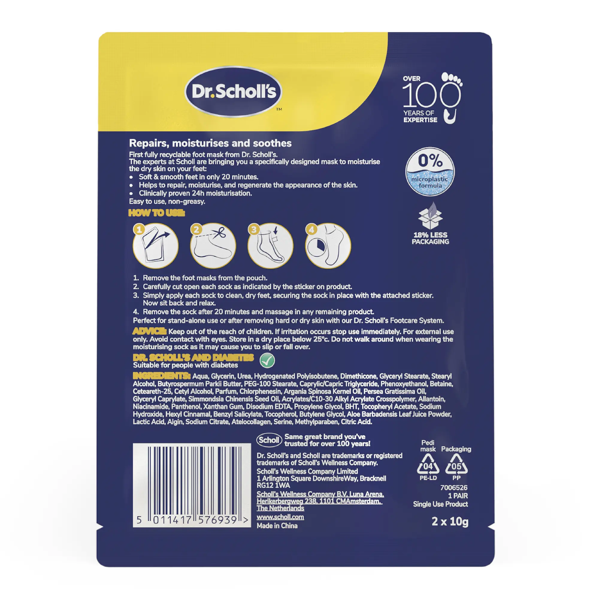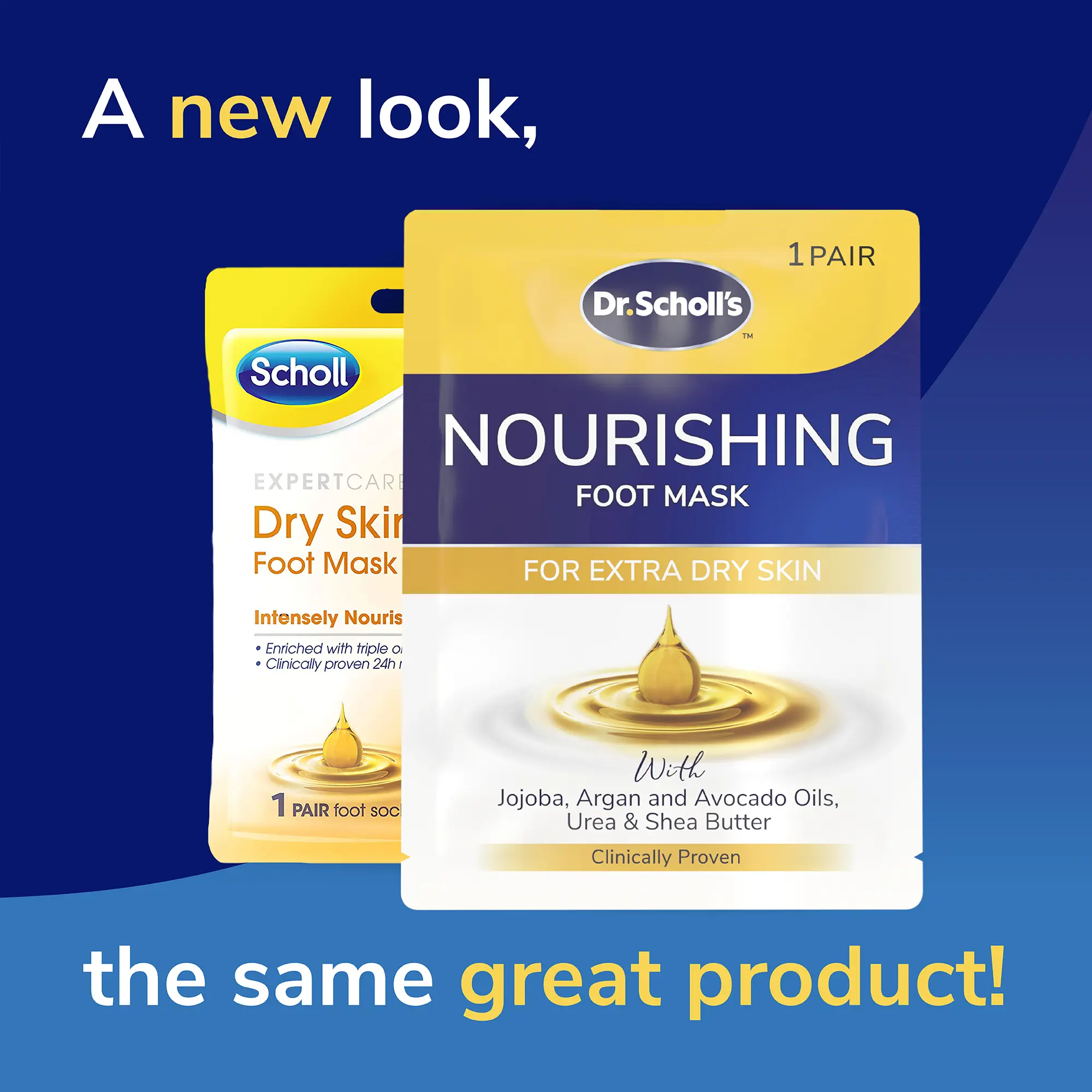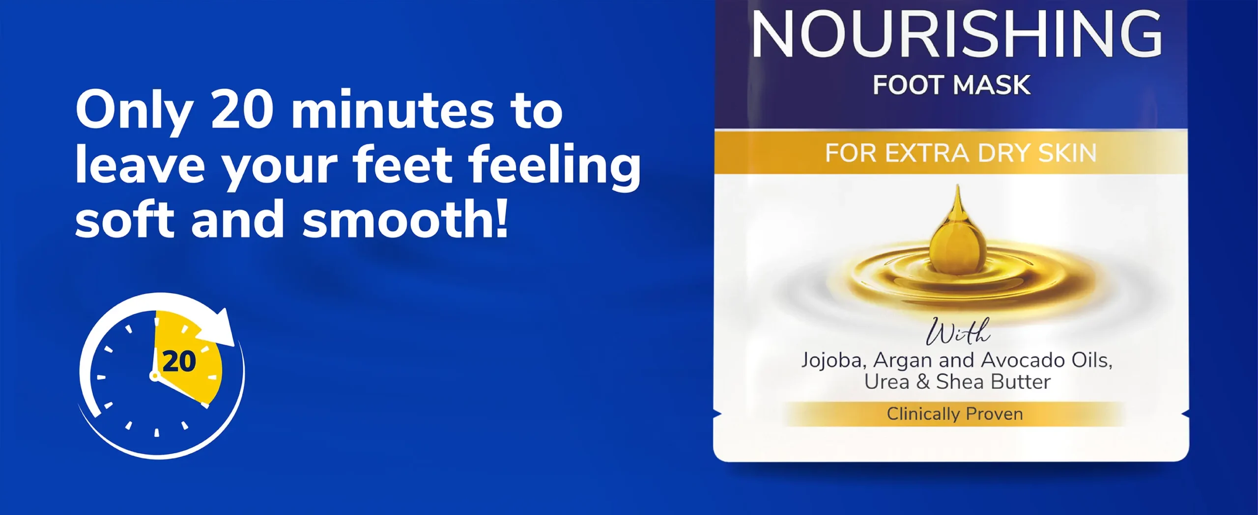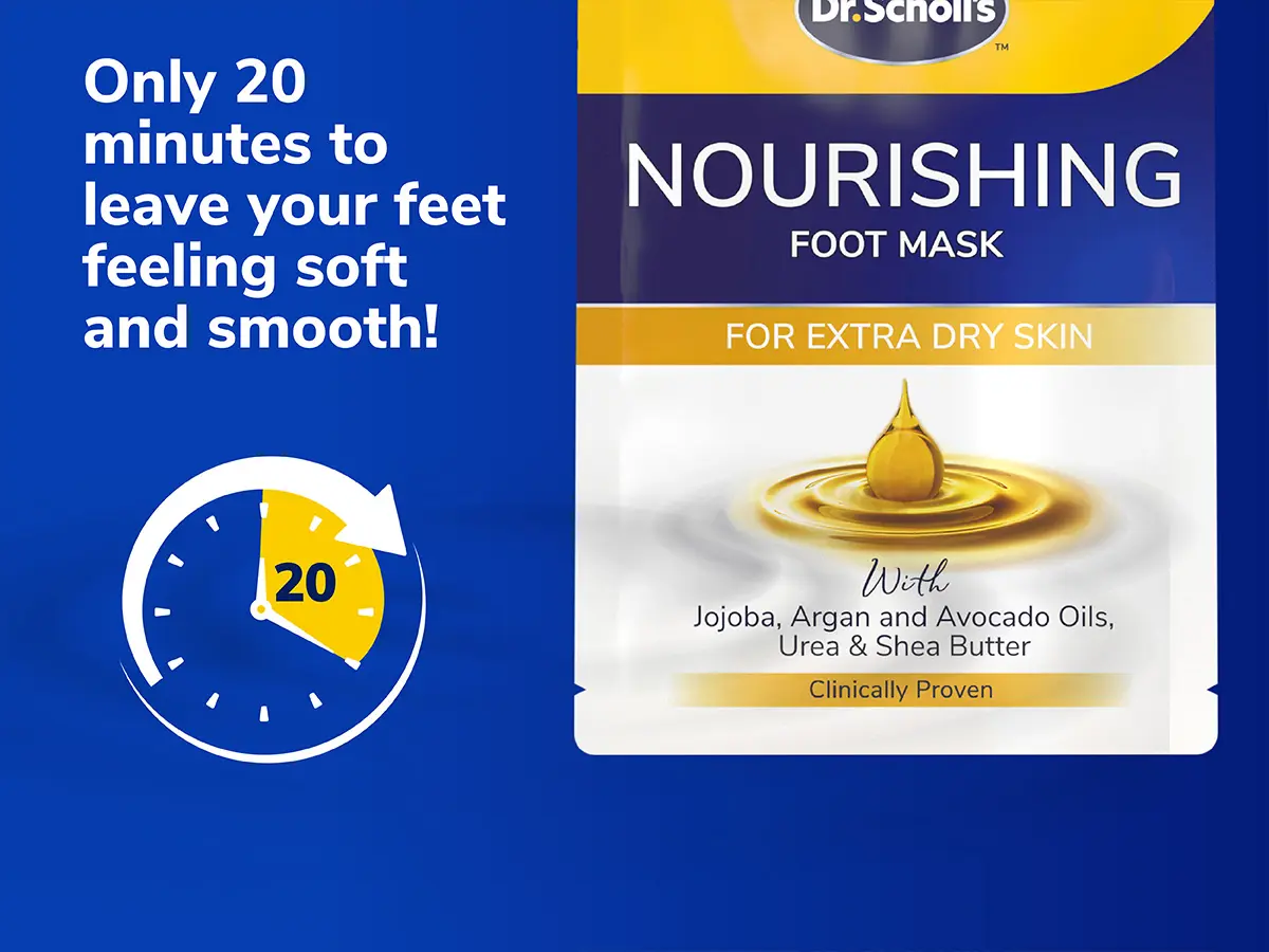 Scholl ExpertCare Dry Skin Foot Mask is enriched with Urea and our triple oil blend: Avocado, Jojoba and Argan. It repairs, moisturises and regenerates. Our foot mask for dry skin has been clinically proven to moisturise your feet for 24 hours in just 1 application and help repair cracked heels. For silky smooth, long-lasting results to show off your feet, try it today.