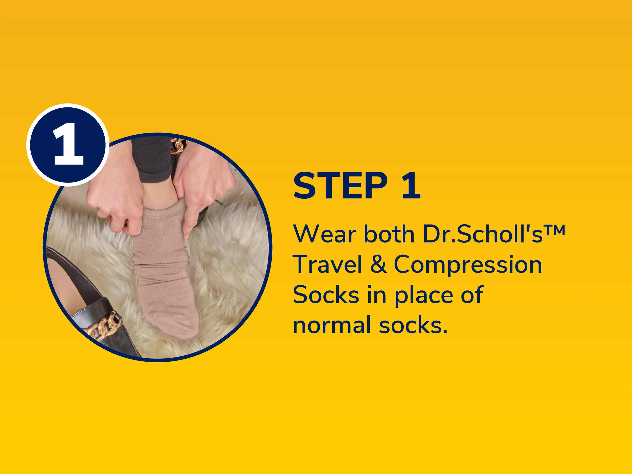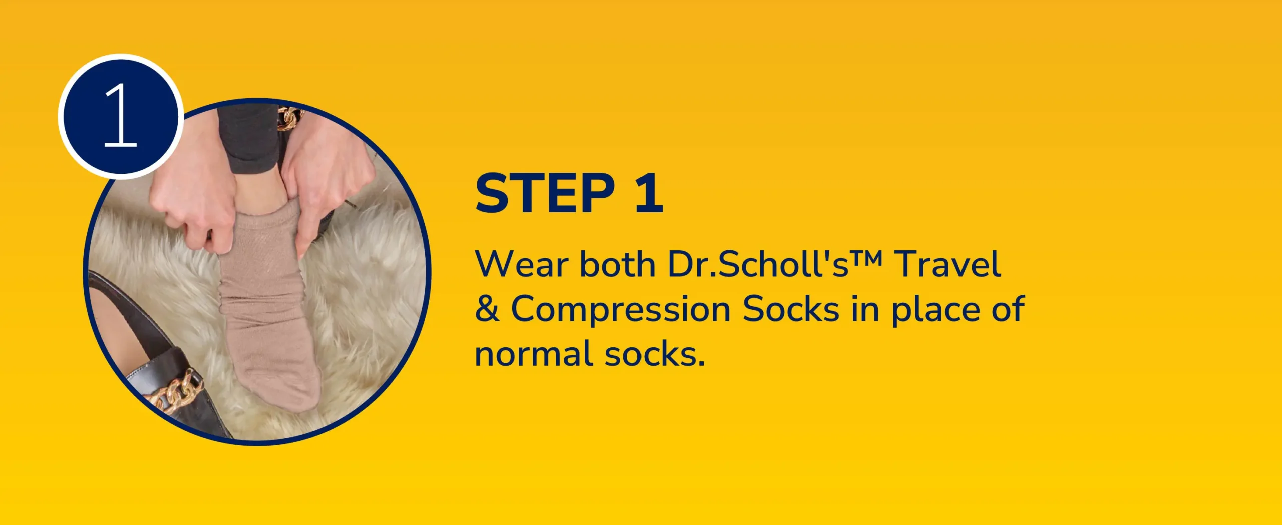 Scholl Flight Socks are designed to be worn in place of normal socks throughout your entire journey. Always wear both socks and ensure they are pulled up to just below the knee.
