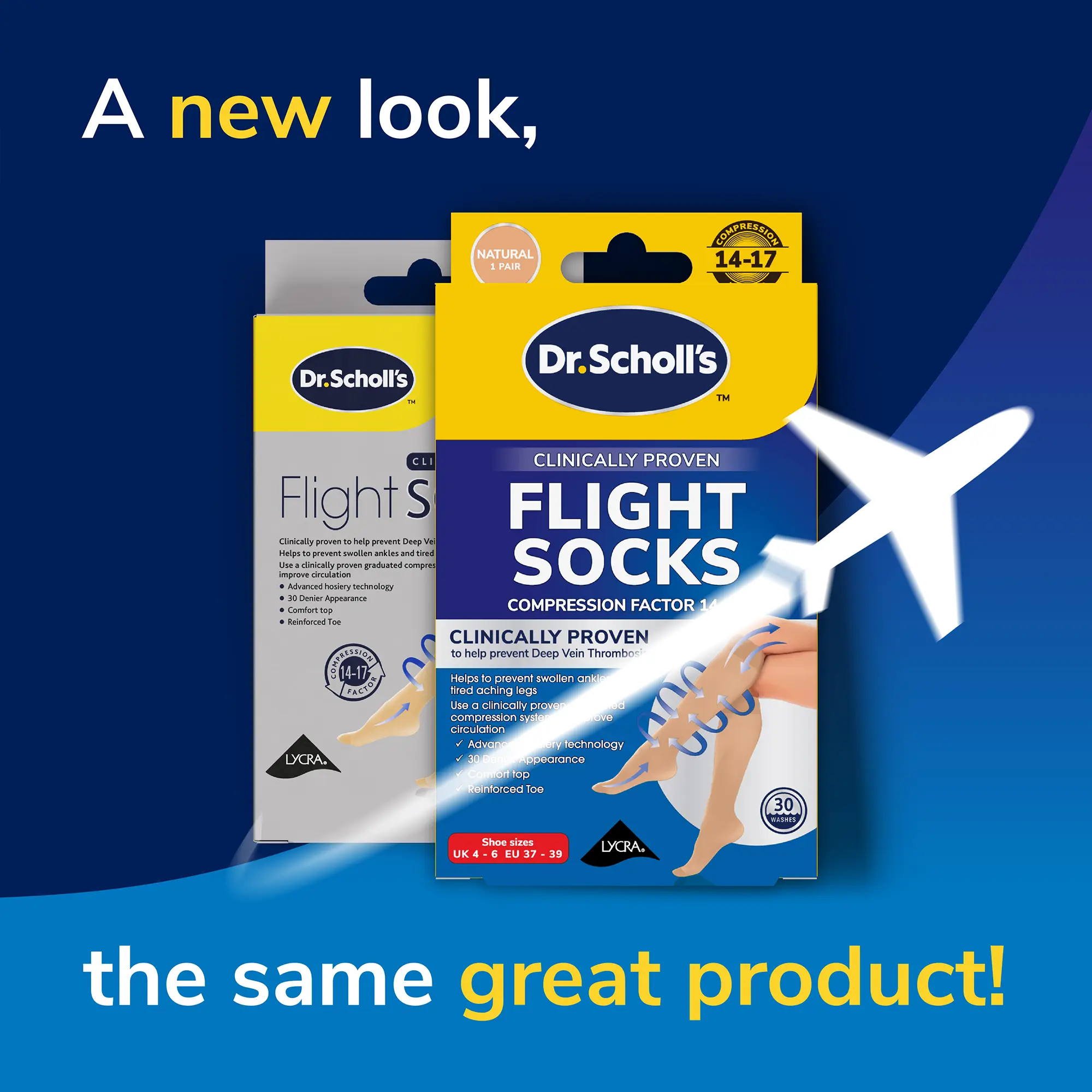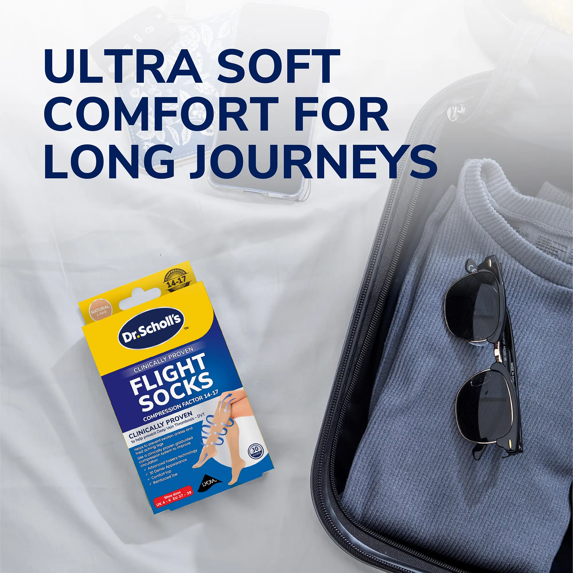 Elevate your travel experience with Scholl’s Flight Socks, designed to enhance leg health during long journeys. Combat issues like Deep Vein Thrombosis (DVT), swollen ankles, and tired legs with medium graduated compression (14-17mmHg), promoting optimal blood circulation. Crafted from Lycra, these 30 denier semi-sheer socks offer comfort and style in ‘Natural’ Colour, featuring a reinforced toe. Enjoy the journey with antimicrobial protection to keep your feet fresh. Simple to use, wear them instead of regular socks, ensuring they reach just below the knee. Pack includes one pair for UK size 4-6 or EU 37-39.