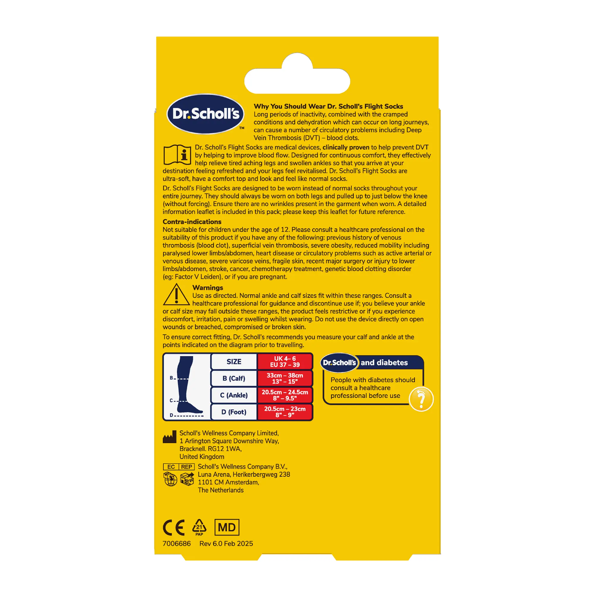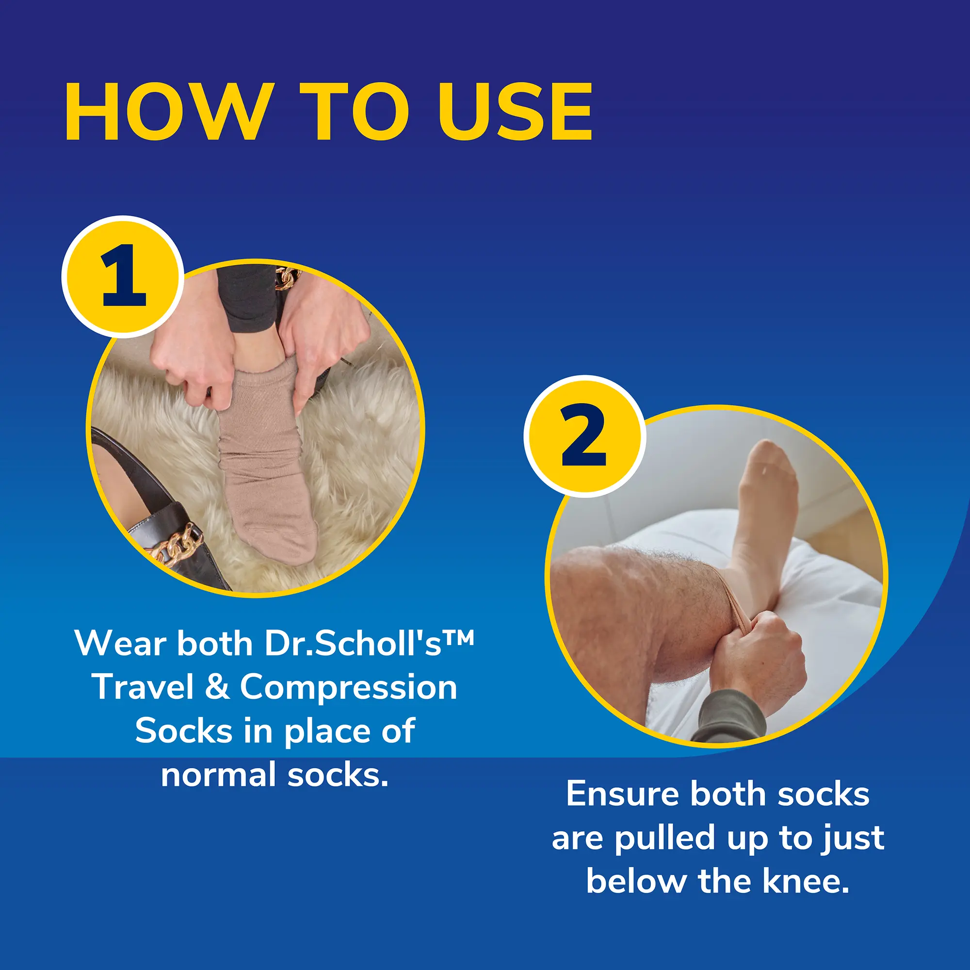 HOW TO USE: Scholl Flight Socks are designed to be worn in place of normal socks throughout your entire journey; always wear both socks and ensure they are pulled up to just below the knee; a detailed information leaflet is included in the pack, please keep the leaflet for future reference.