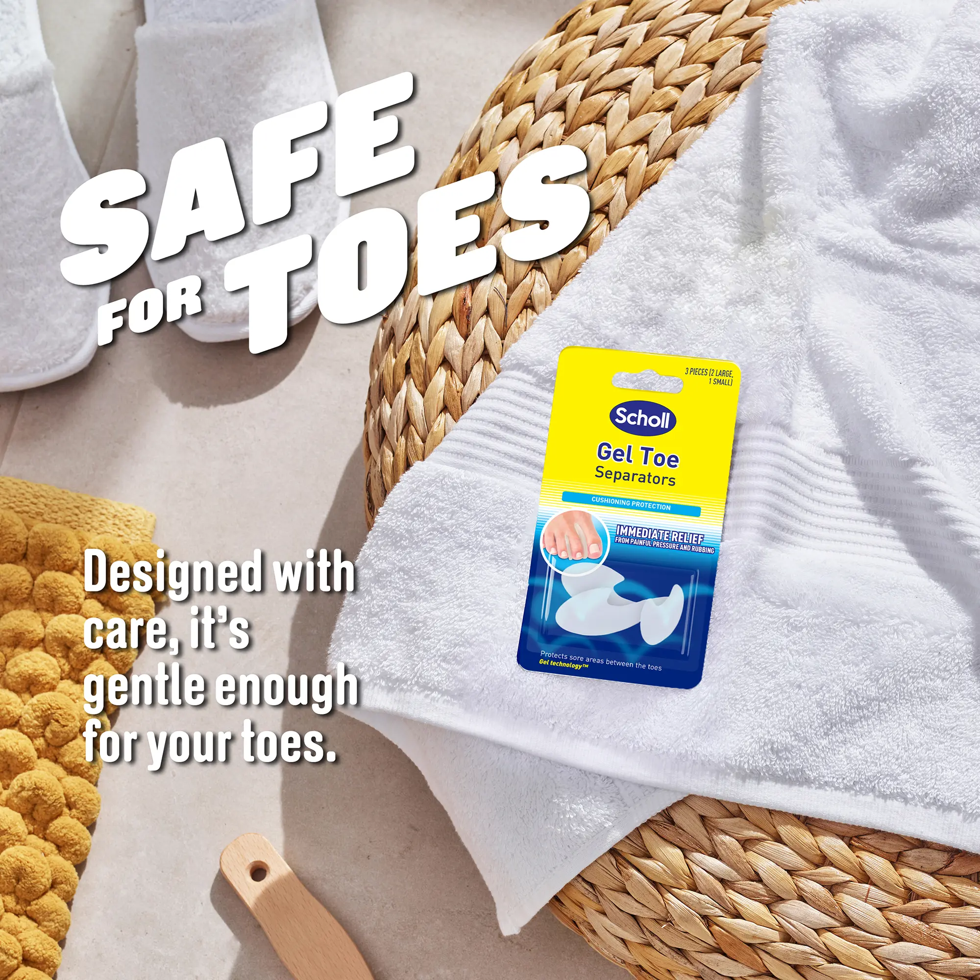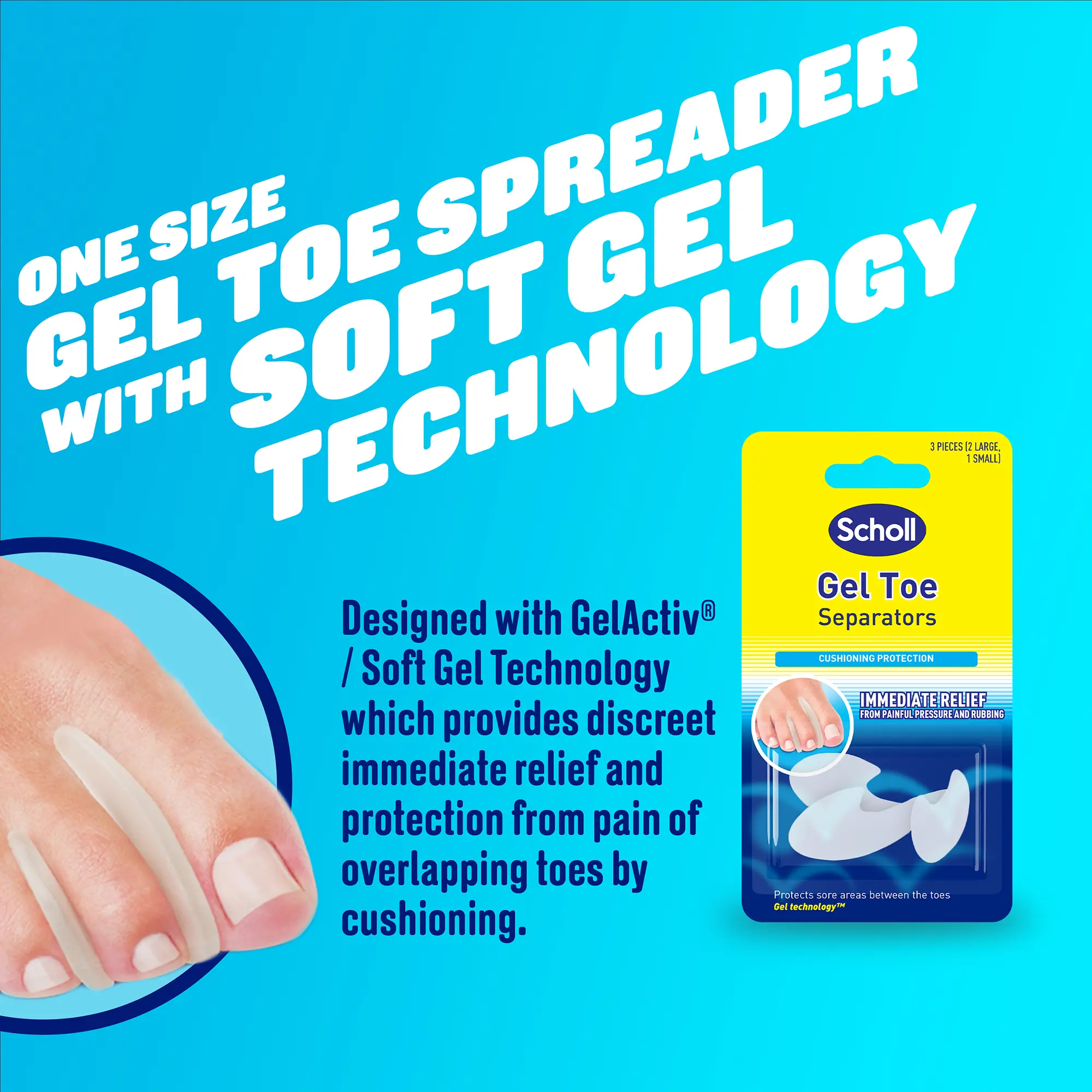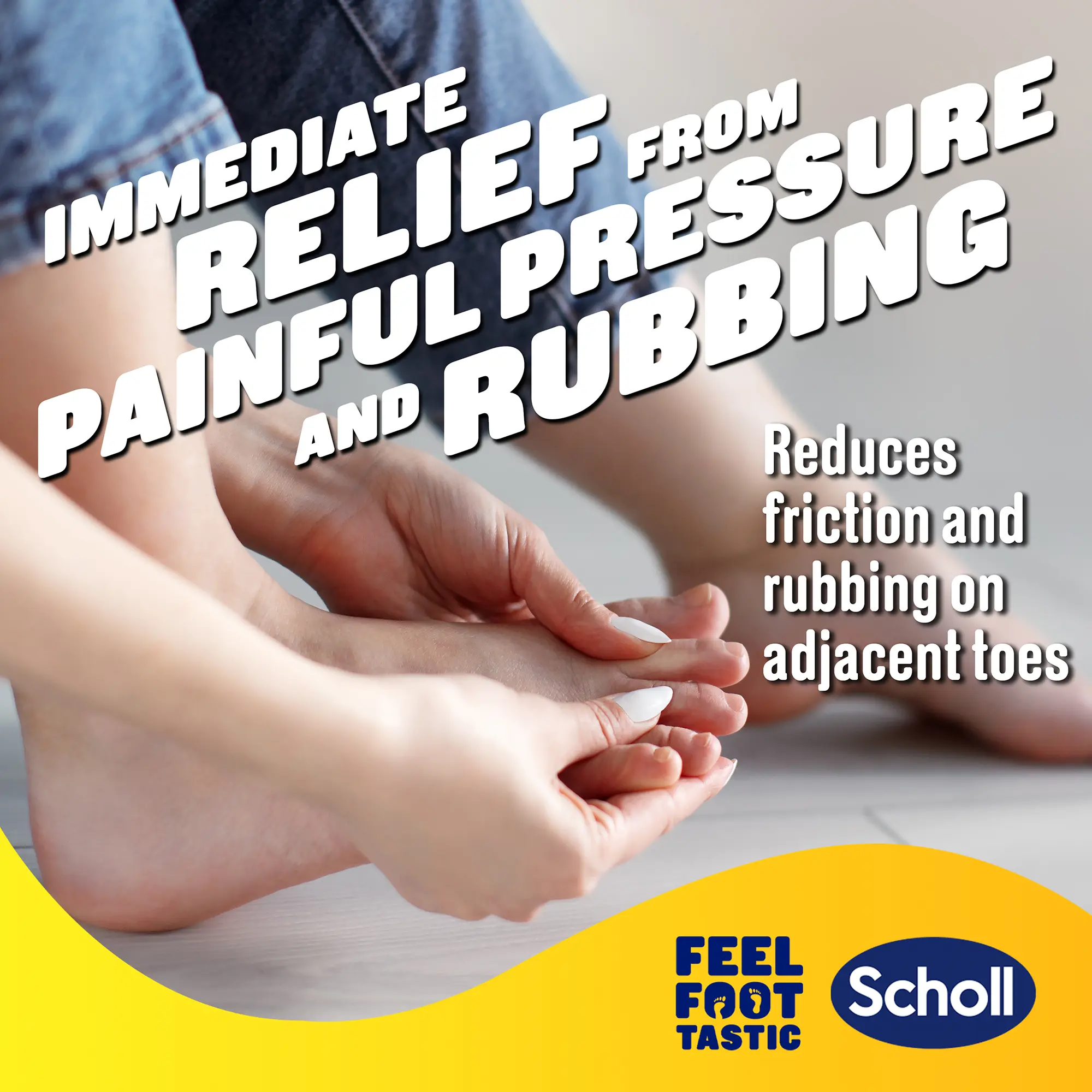 IMMEDIATE PAIN RELIEF: Scholl Gel Toe Separators provide instant relief from rubbing and soreness between the toes, reducing discomfort caused by friction and pressure.
