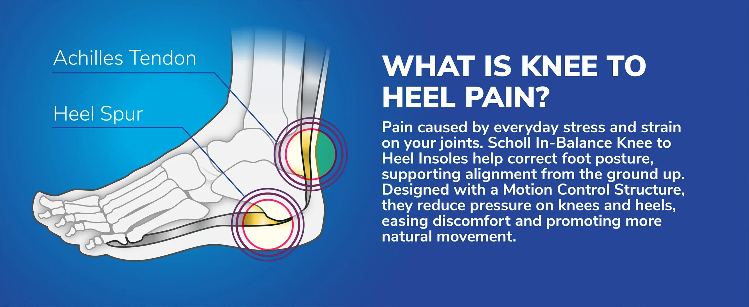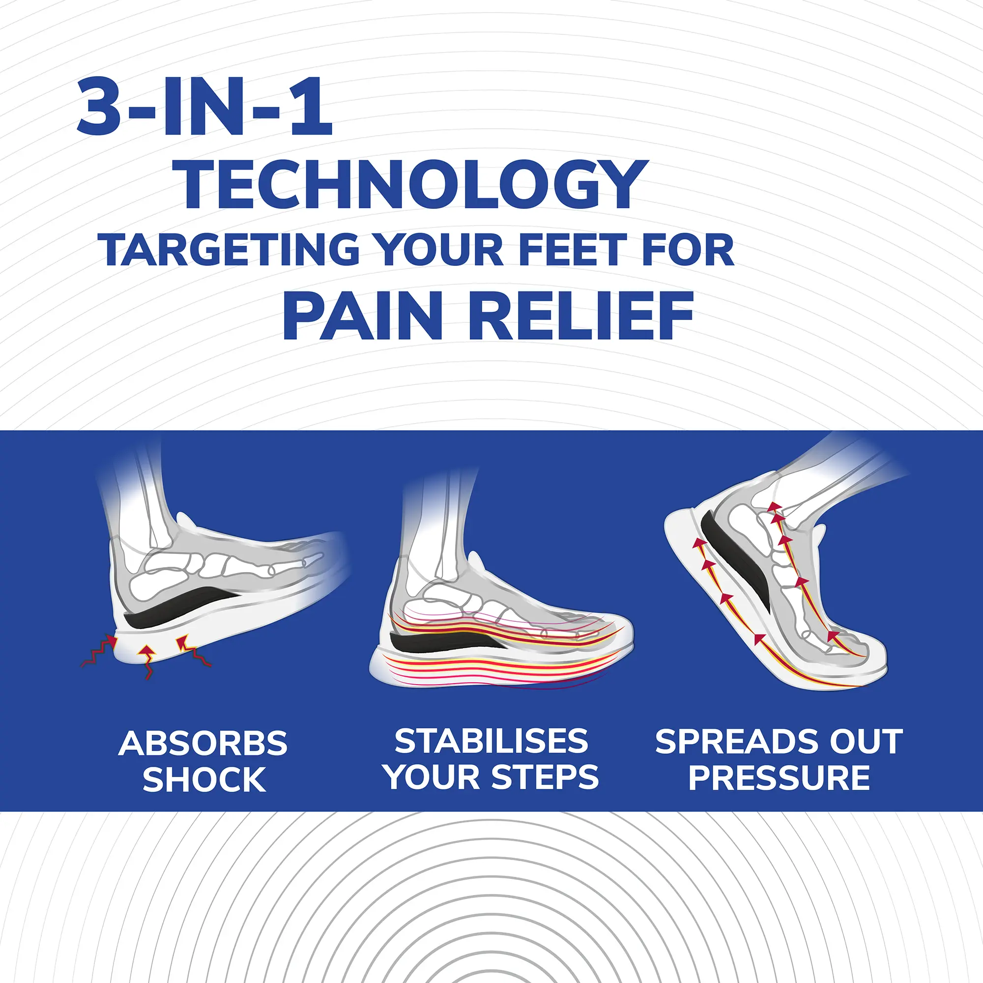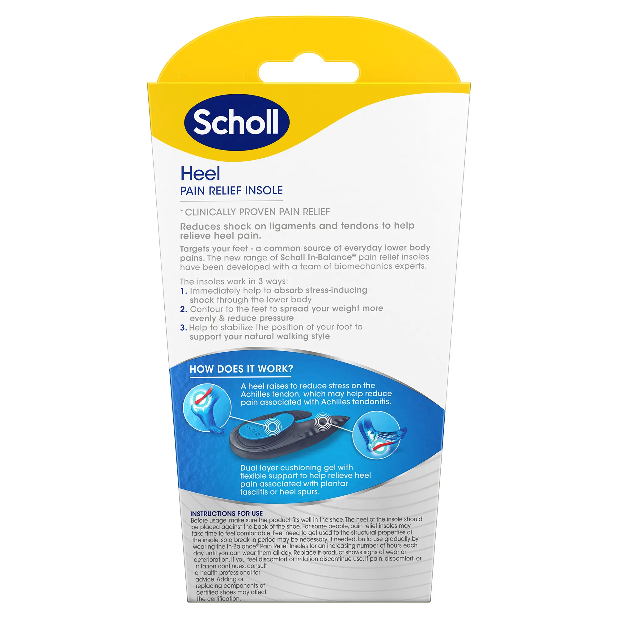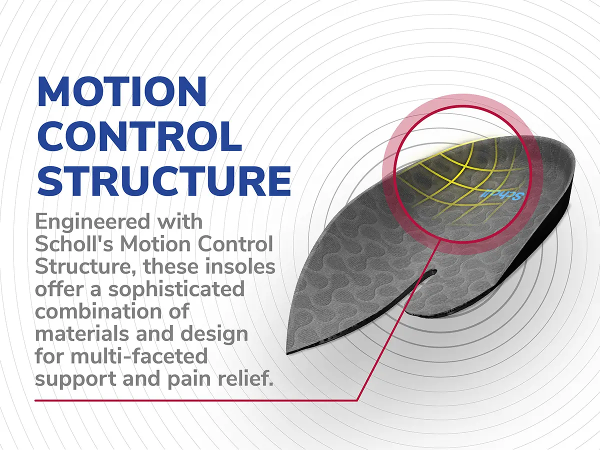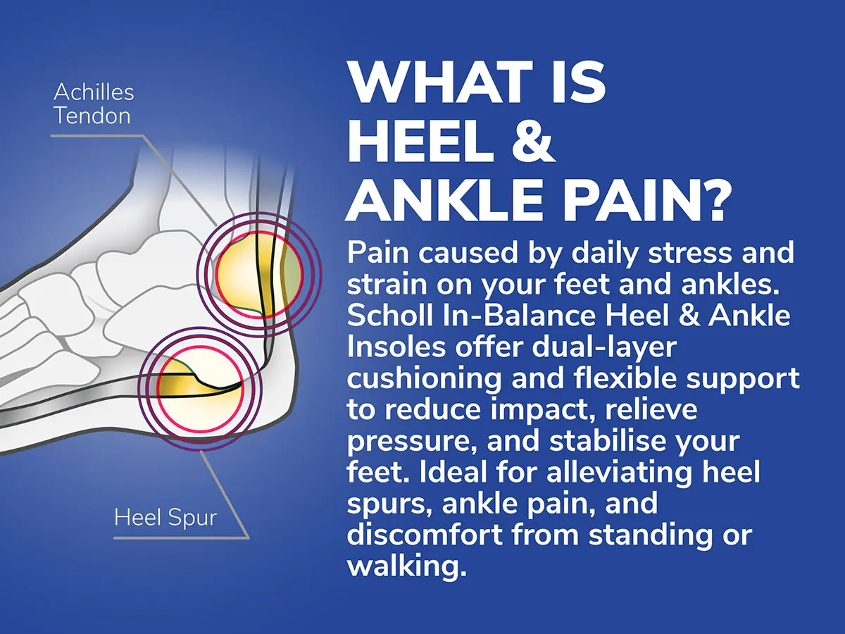 HELPS RELIEVE HEEL & ANKLE PAIN: Scholl InBalance Pain Relief Insoles help relieve the heel and ankle pain you can experience from being on your feet all day. Developed with a team of biomechanical experts, they have a Motion Control Structure and have been designed to work in three ways: Shock absorption, pressure redistribution and stabilisation. Heel pain relief insoles have a dual layer of cushioning gel with flexible support to help relieve heel pain.