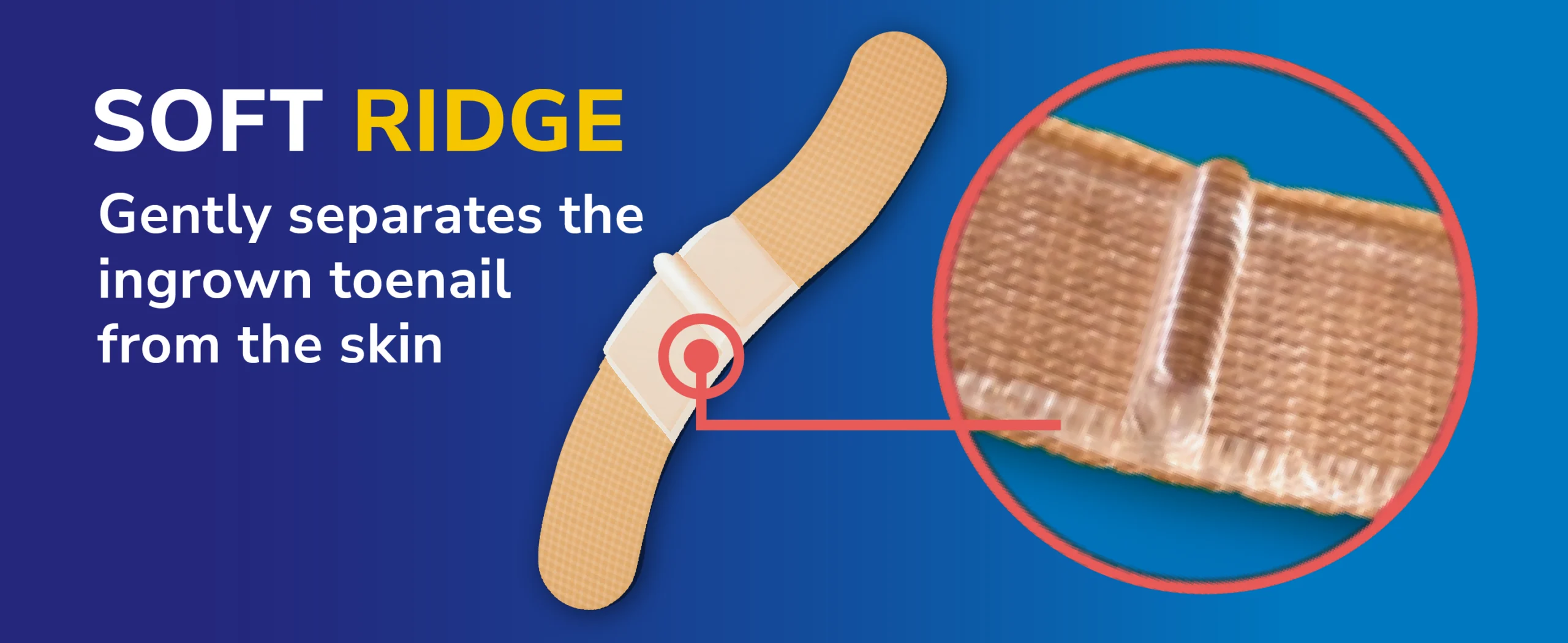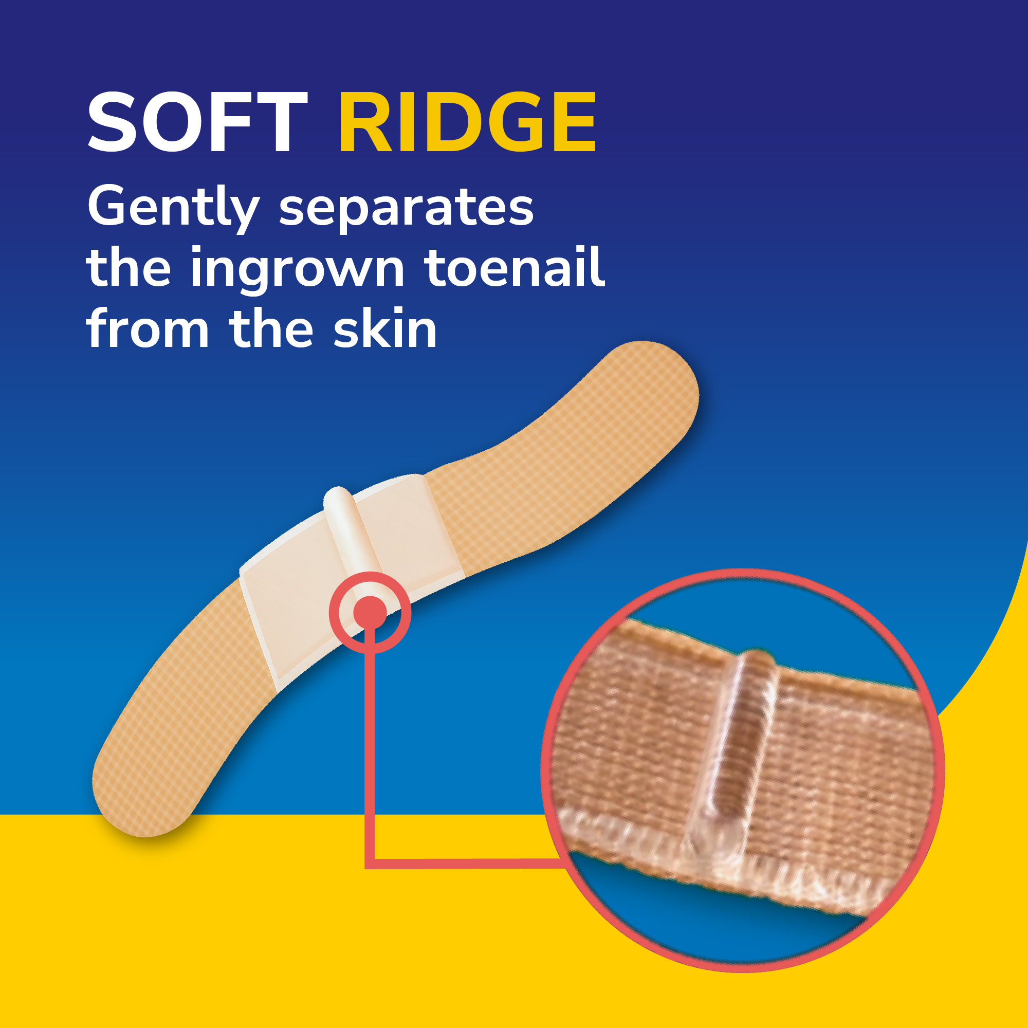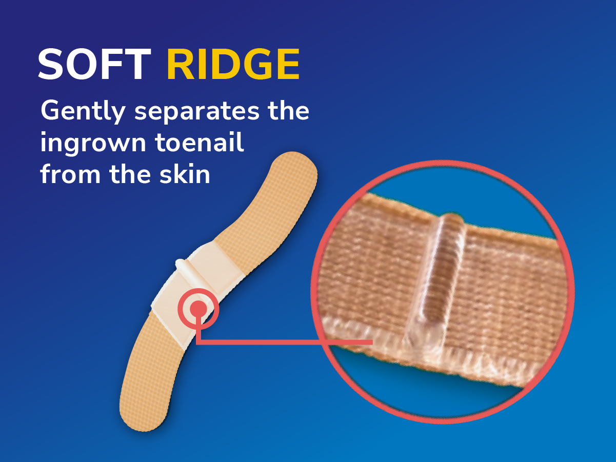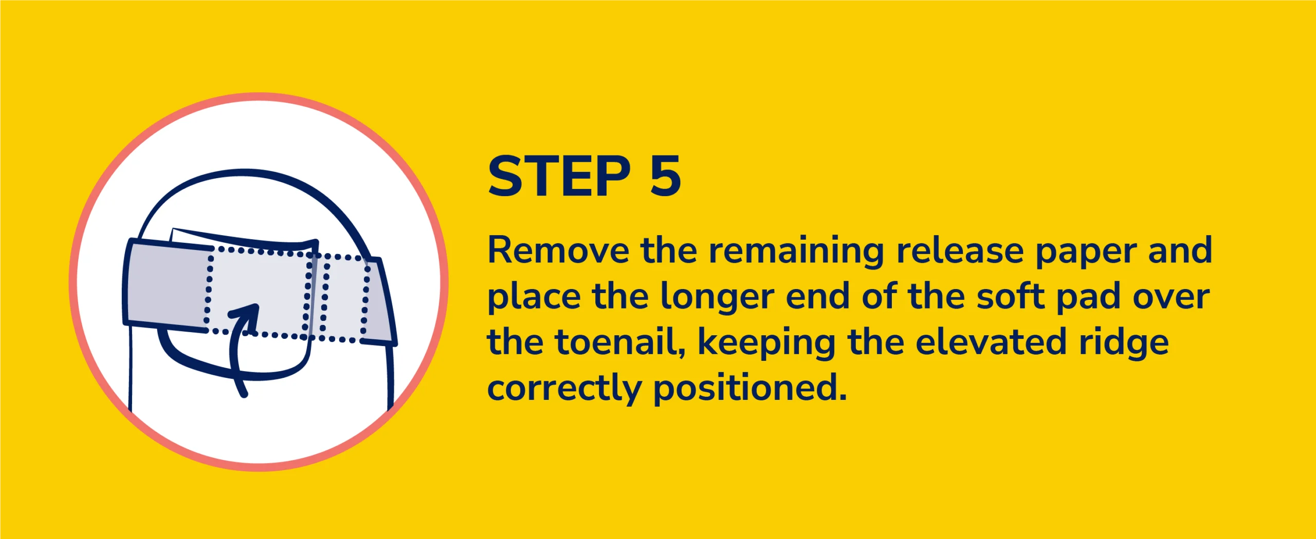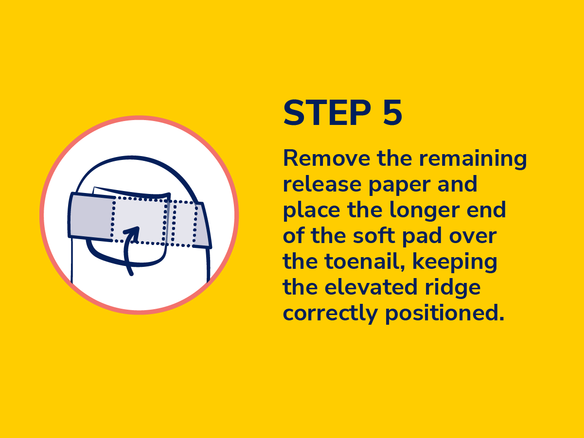 5. Remove the remaining release paper and place the longer end of the soft pad over the toenail, keeping the elevated ridge correctly positioned.