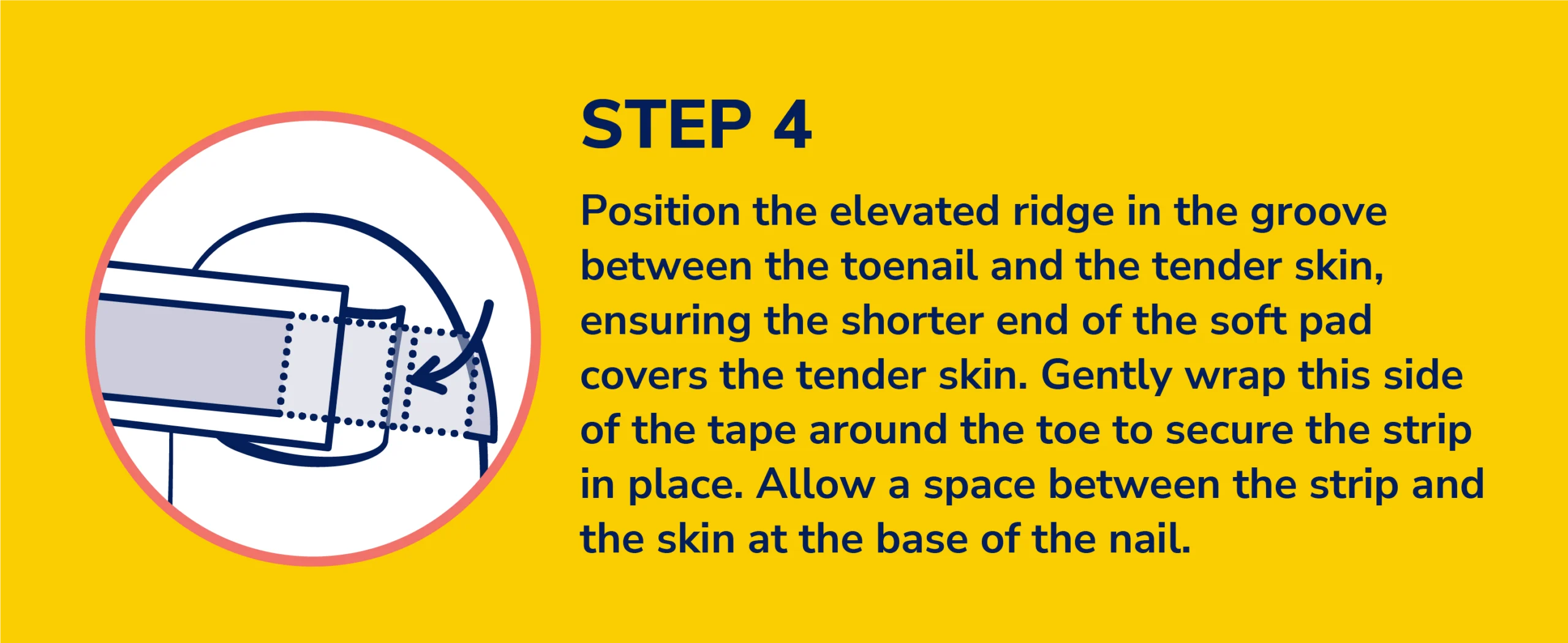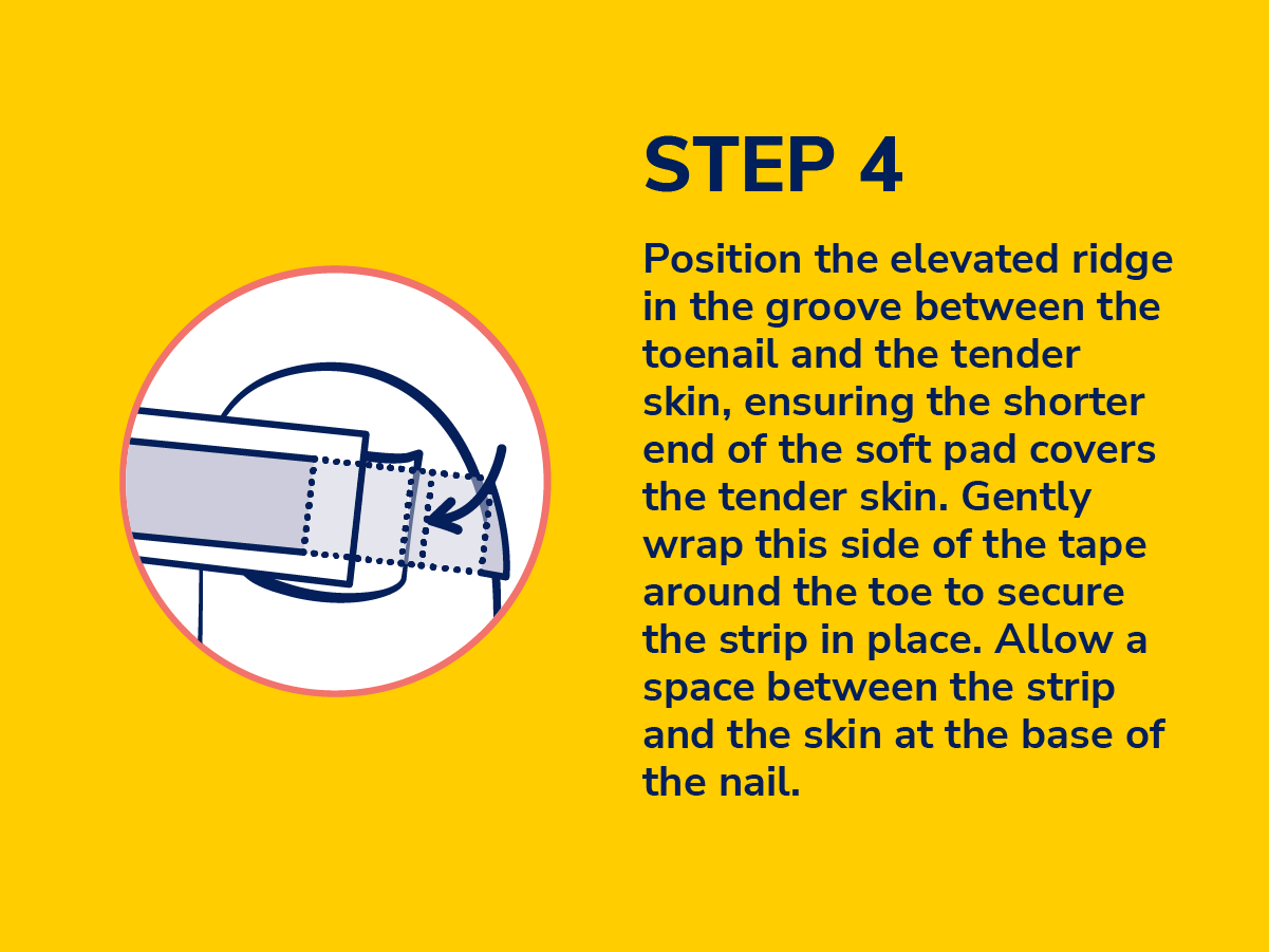 4. Position the elevated ridge in the groove between the toenail and the tender skin, ensuring the shorter end of the soft pad covers the tender skin. Gently wrap this side of the tape around the toe to secure the strip in place. Allow a space between the strip and the skin at the base of the nail.
