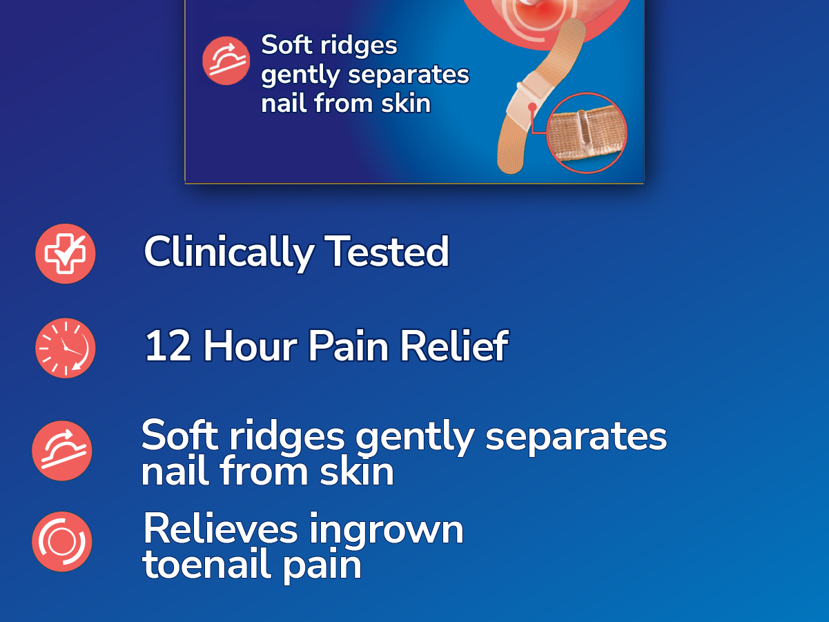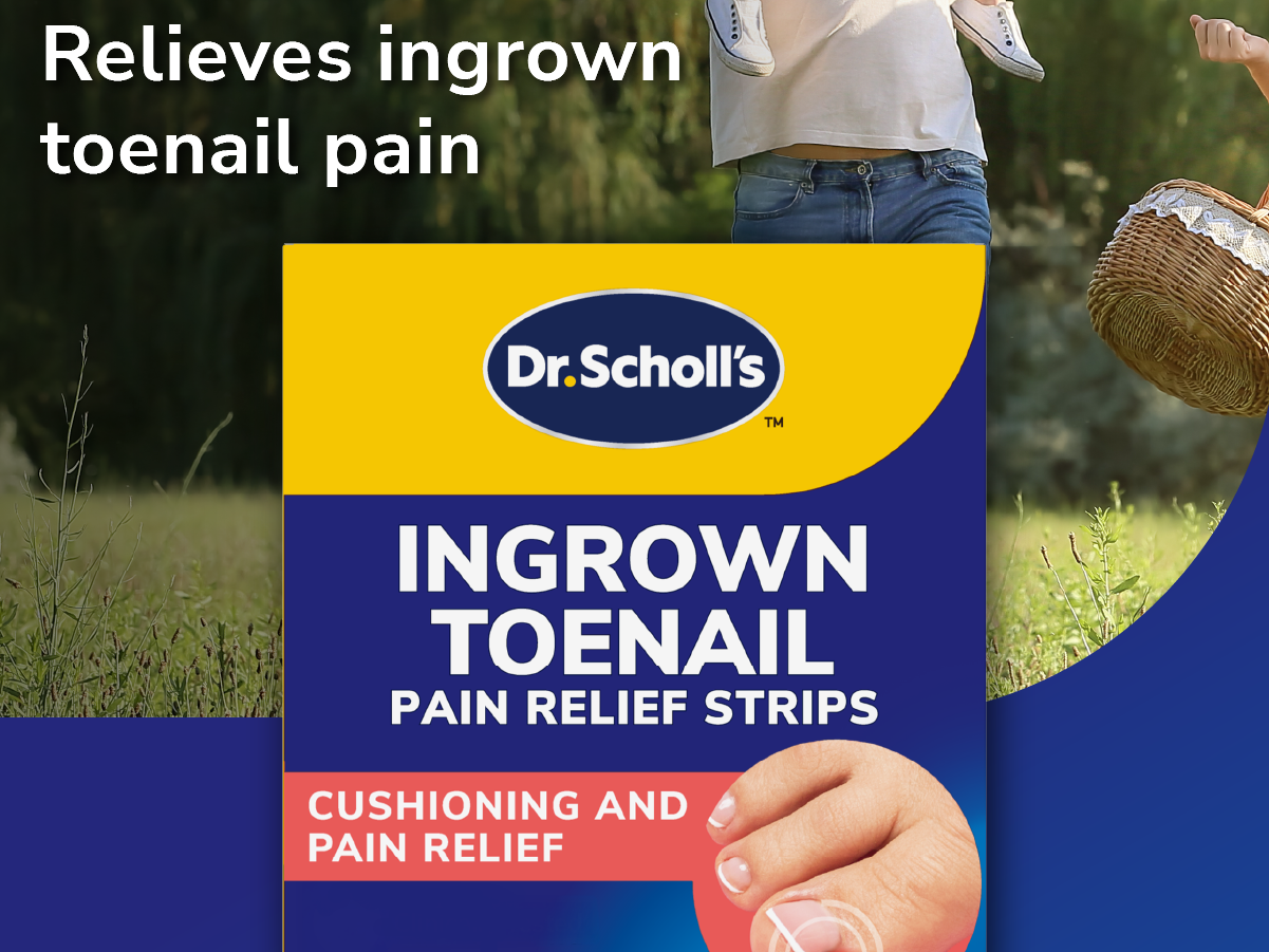 Dr. Scholl’s Ingrown Toenail Pain Relief Strips are clinically tested to provide up to 12-hour pain relief and are designed to reduce the discomfort from those experiencing ingrown toenail. All-day cushioning gives gentle protection to the toe, reduces discomfort caused by pressure from footwear, and helps make walking more comfortable.