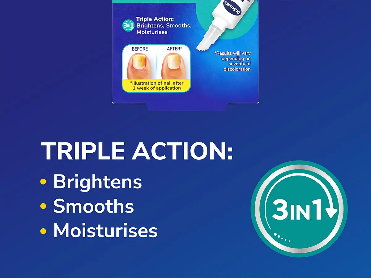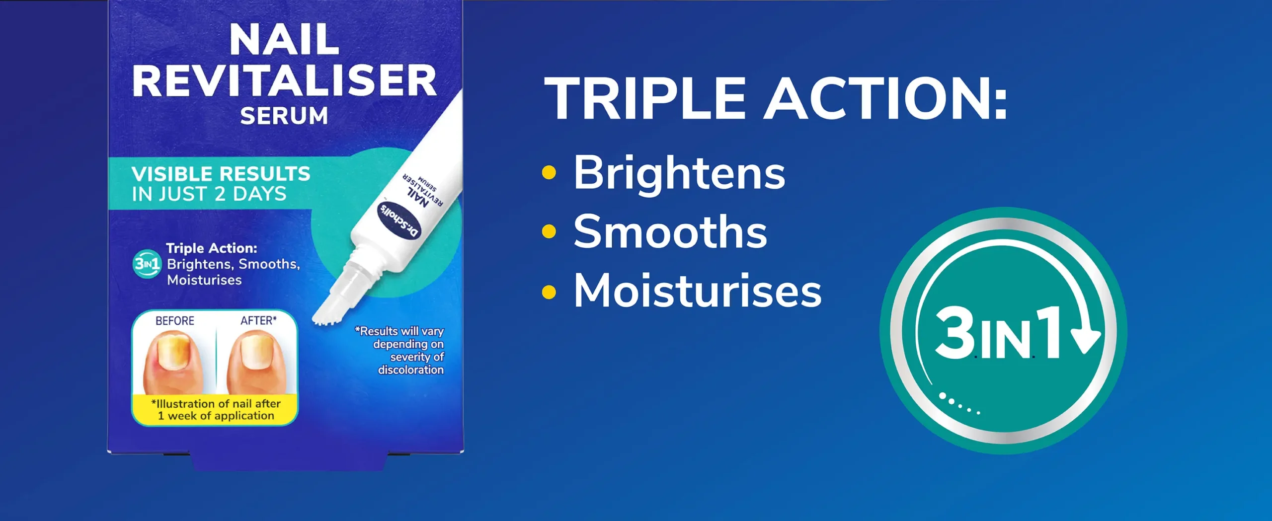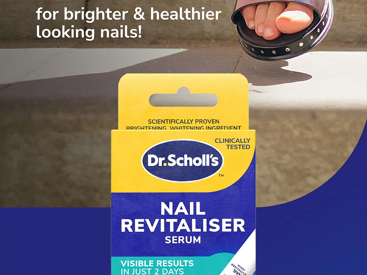 Dr. Scholl’s Nail Revitaliser Serum delivers visible results in just 2 days, helping to improve nail appearance and boost your confidence. Specially formulated for fast and effective results, this serum enhances the look of nails, even those previously damaged by nail fungus, restoring them to a healthier-looking state. Its 3-in-1 triple-action formula brightens, smooths, and moisturises nails, leaving them refreshed and revitalised. Clinically tested and scientifically proven, the brightening ingredient ensures trusted and reliable results for damaged nails. Suitable for all nail types, the easy-to-use application makes caring for your nails simple and effective.