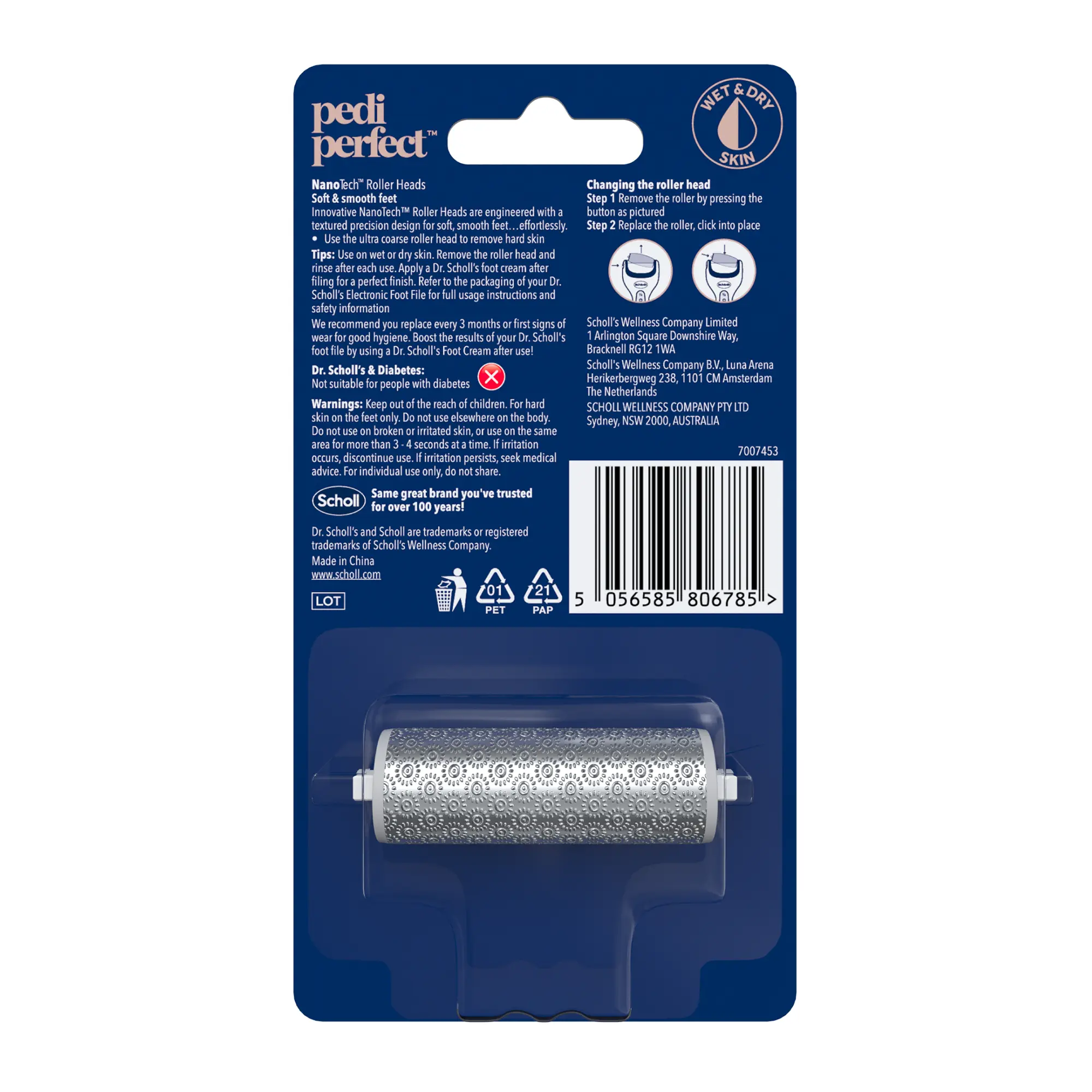NANOTECH ROLLER REPLACEMENT HEADS: Benefit from specially-designed Ultra & Fine Coarse rolling surfaces that exfoliate, smooth, and buff for soft, smooth feet, using Innovative NanoTech roller heads that work on wet or dry skin for consistent, effective foot-care performance