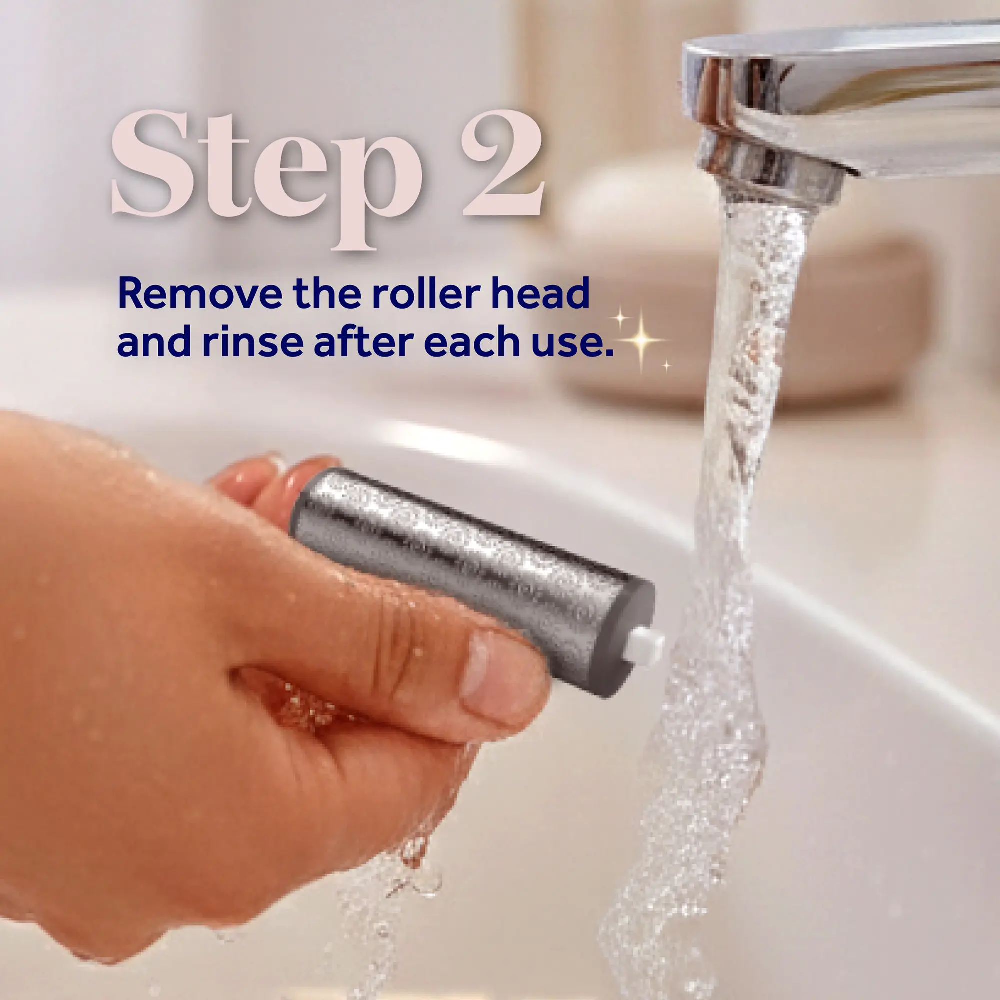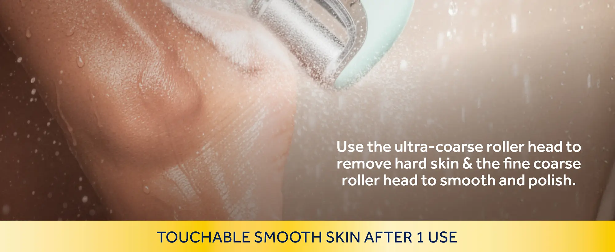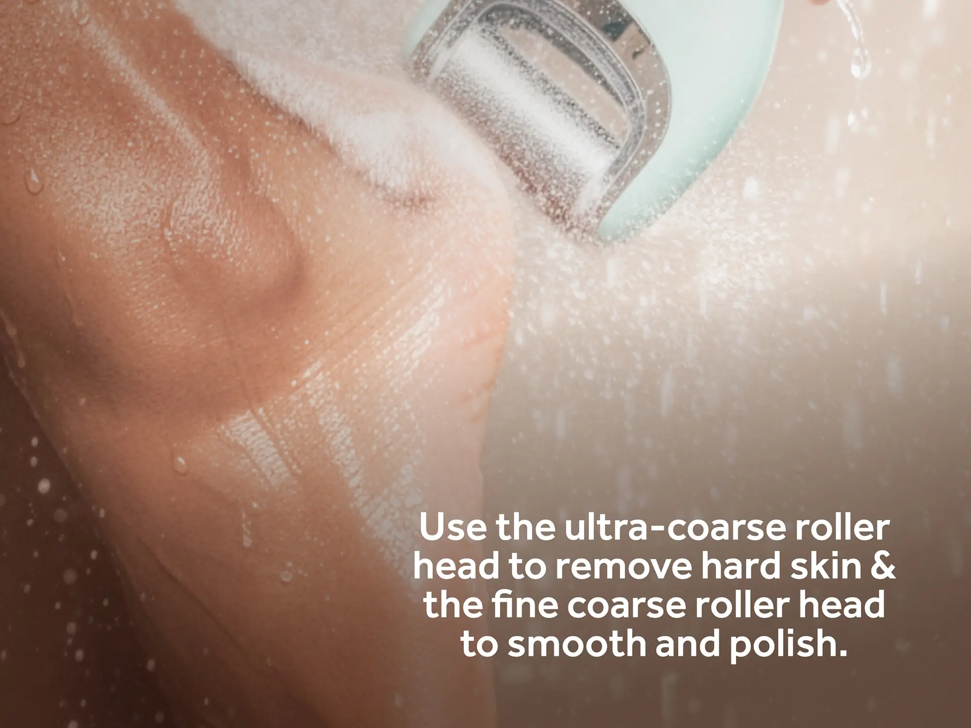 1. Use the Ultra Coarse roller head to gently exfoliate and buff away hard, stubborn calluses on wet or dry skin.
