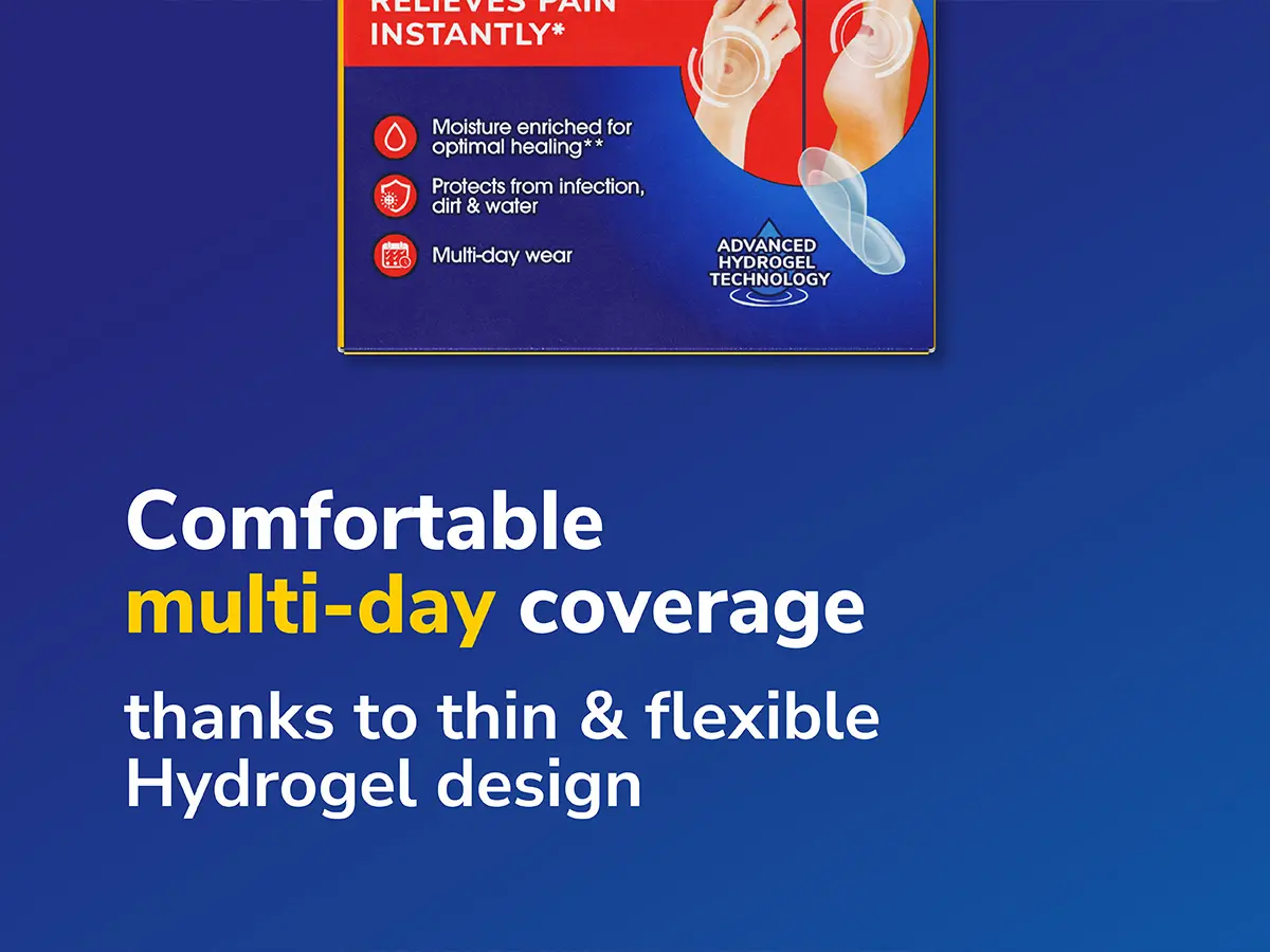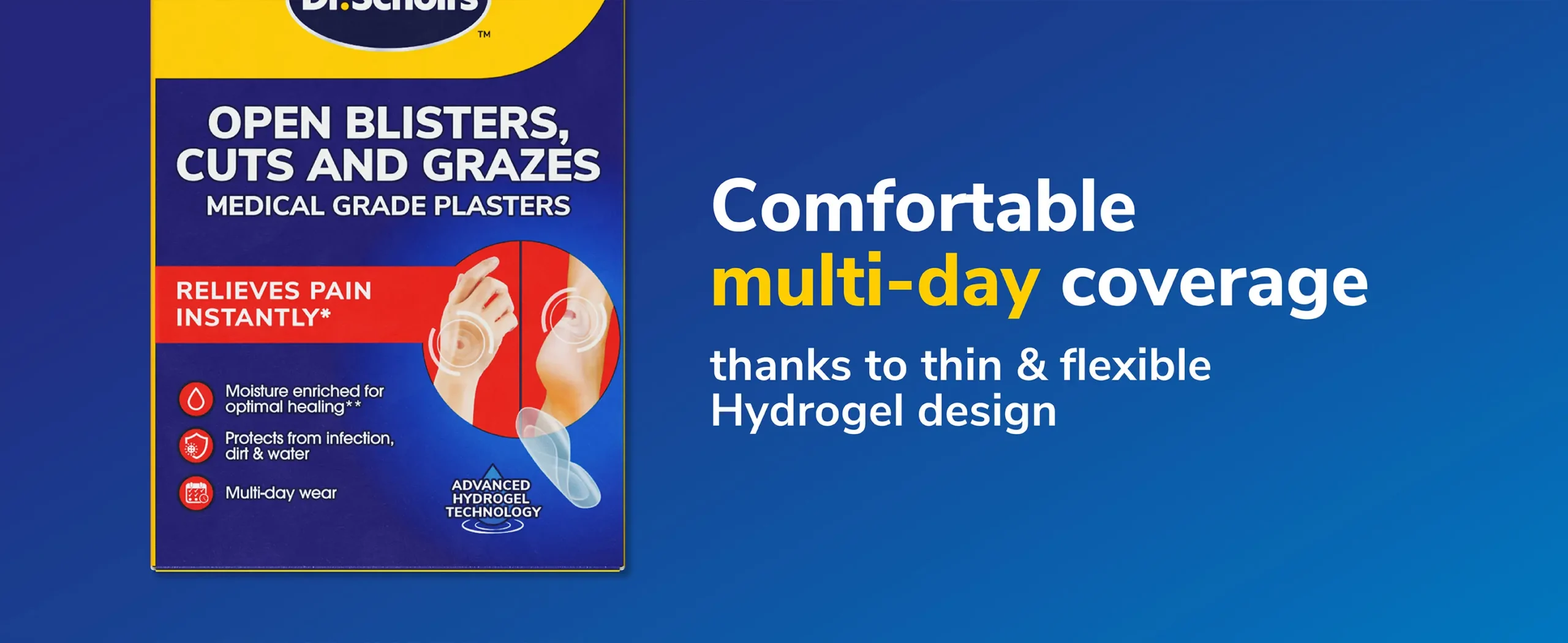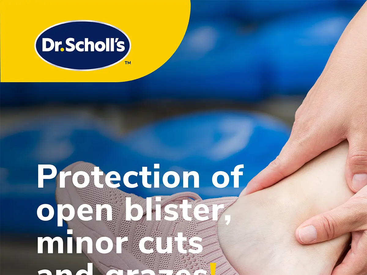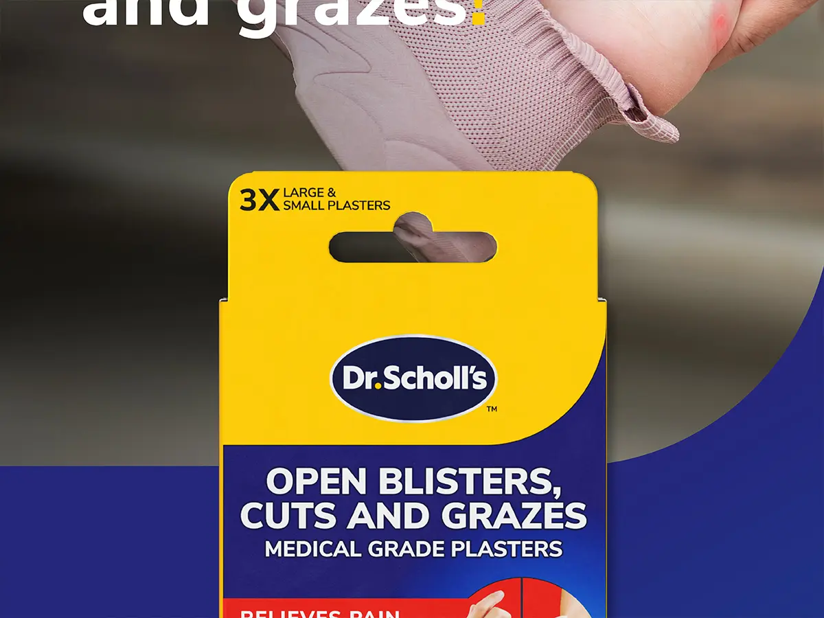 Dr. Scholl’s Medical Grade Blister Plasters provide instant pain relief for open blisters, cuts, and grazes with moisture-enriched hydrogel which, due to its high water content, provides a slight cooling and soothing effect. These modern plasters protect wounds from infection, dirt, and water, ensuring they stay clean and protected to promote faster healing vs no intervention. With hydrogel technology, they create an optimal moisture balance, absorbing exudate and supporting optimal healing conditions. Designed for multi-day wear, they stay firmly in place, offering lasting protection and comfort. Hypoallergenic adhesive and gentle on all skin types, they’re suitable for both adults and children and are easy to remove without sticking to the wound.