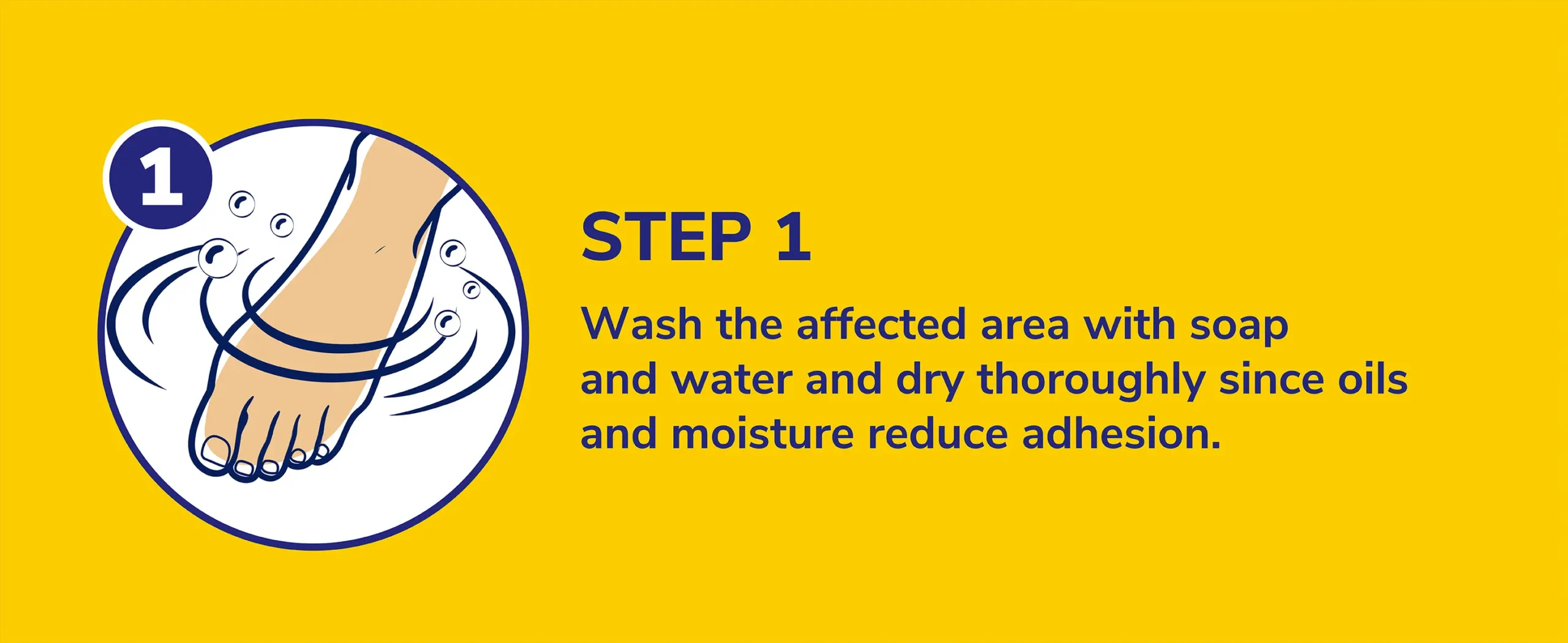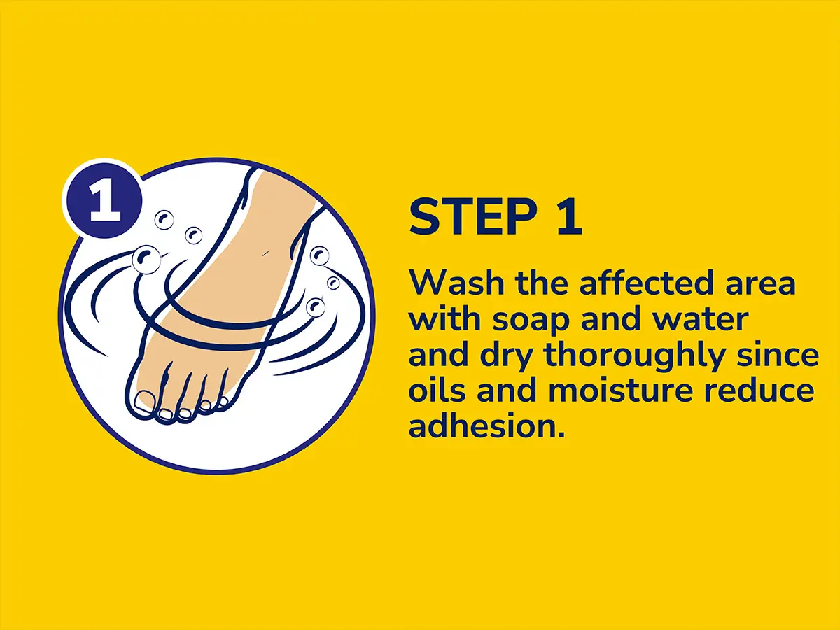 1. Wash the affected area with soap and water and dry thoroughly since oils and moisture reduce adhesion.