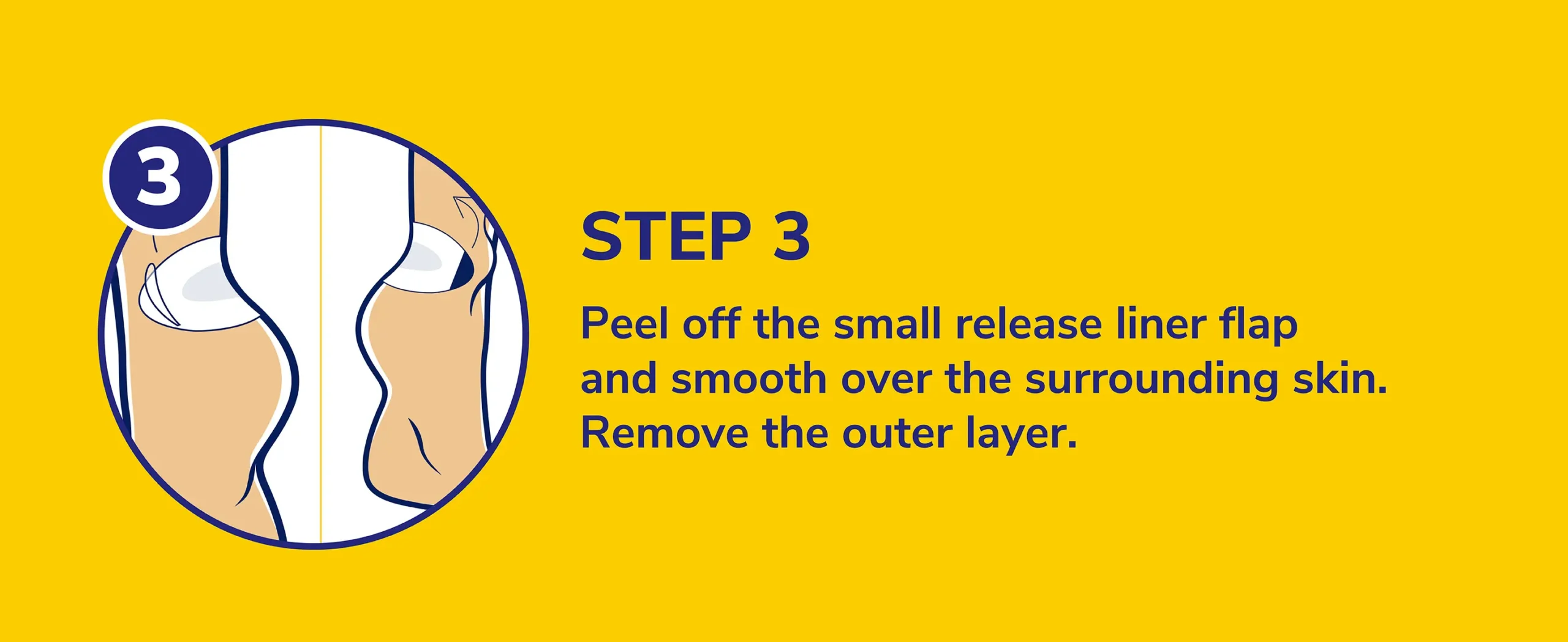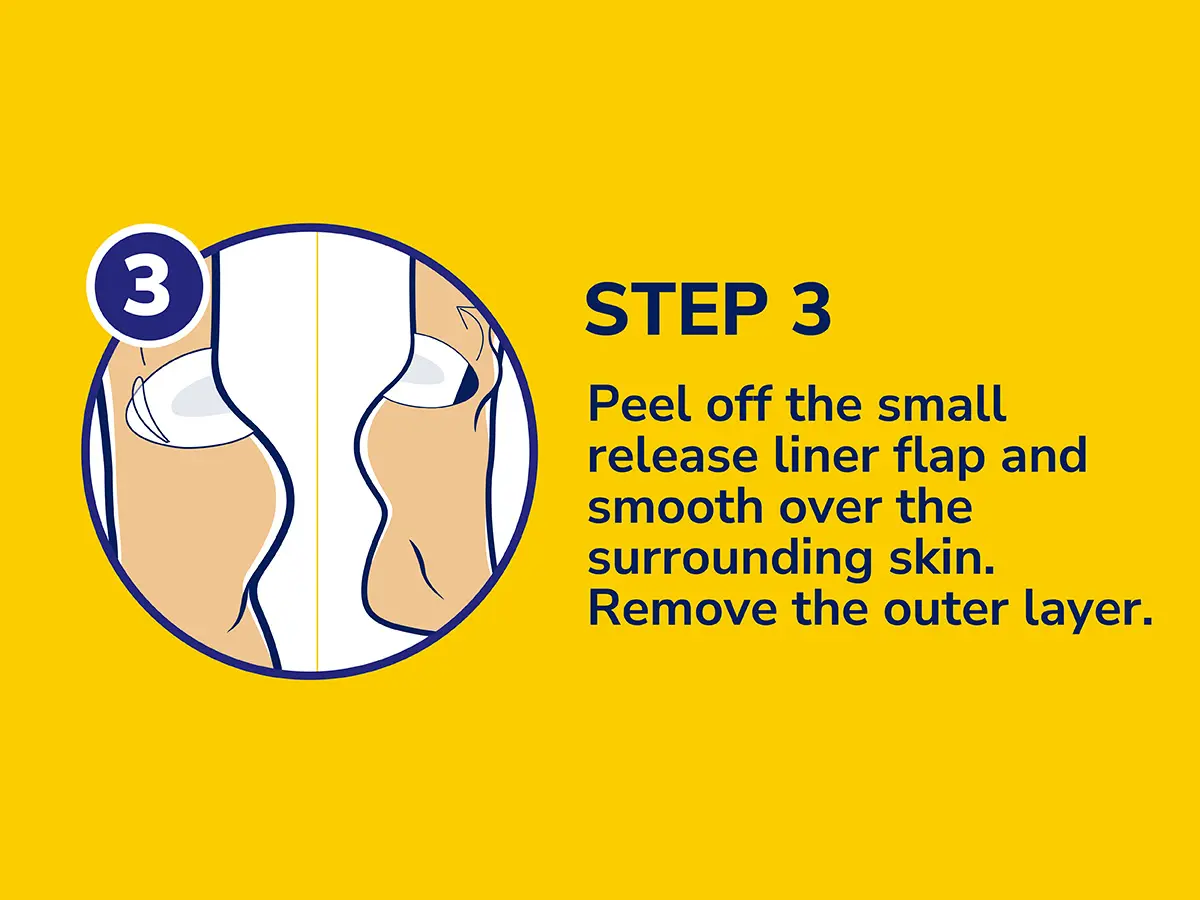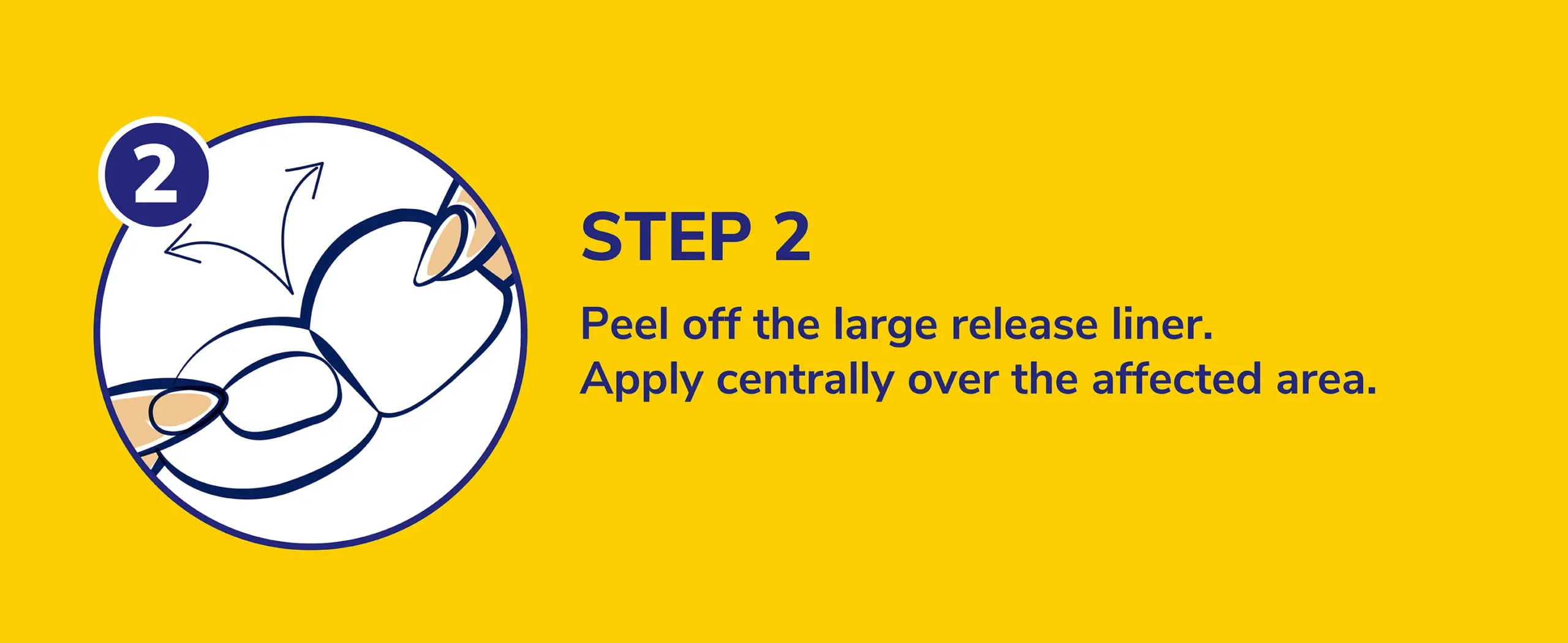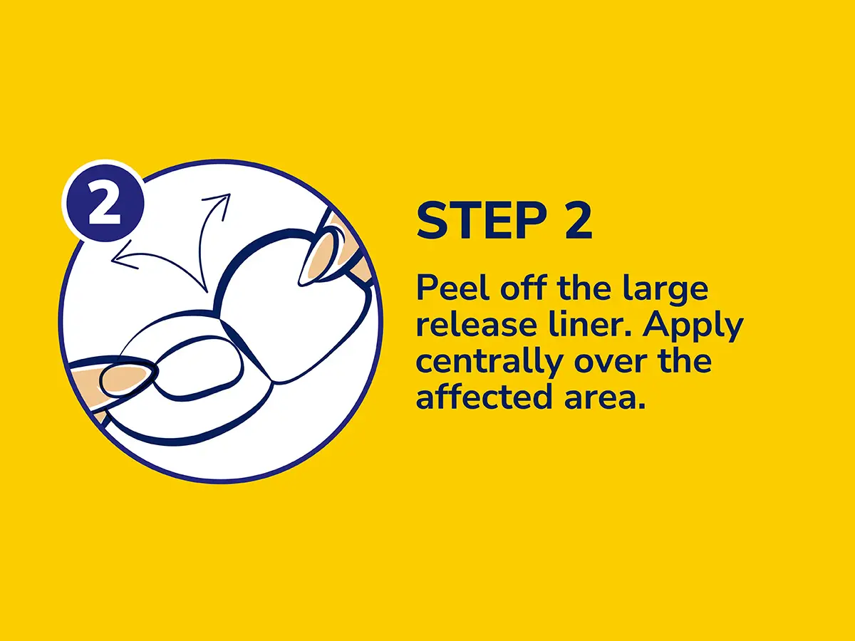 2. Peel off the large release liner (marked #1). Apply centrally over the affected area.