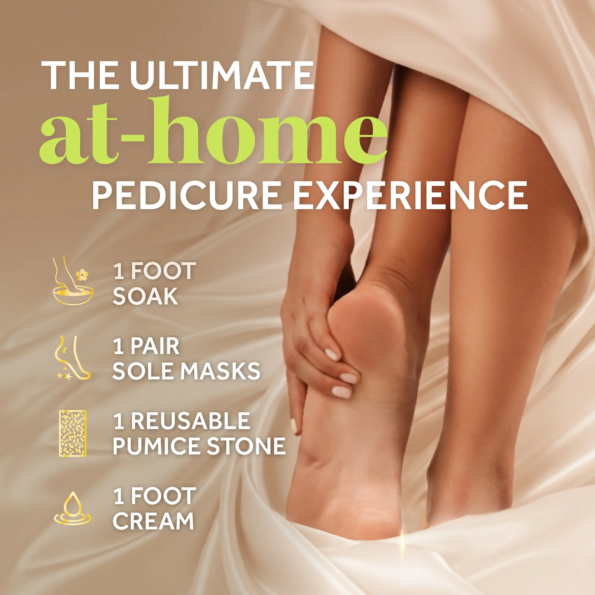 x1 Foot soak, x1 Sole mask, x1 Reusable pumice stone, x1 Foot cream