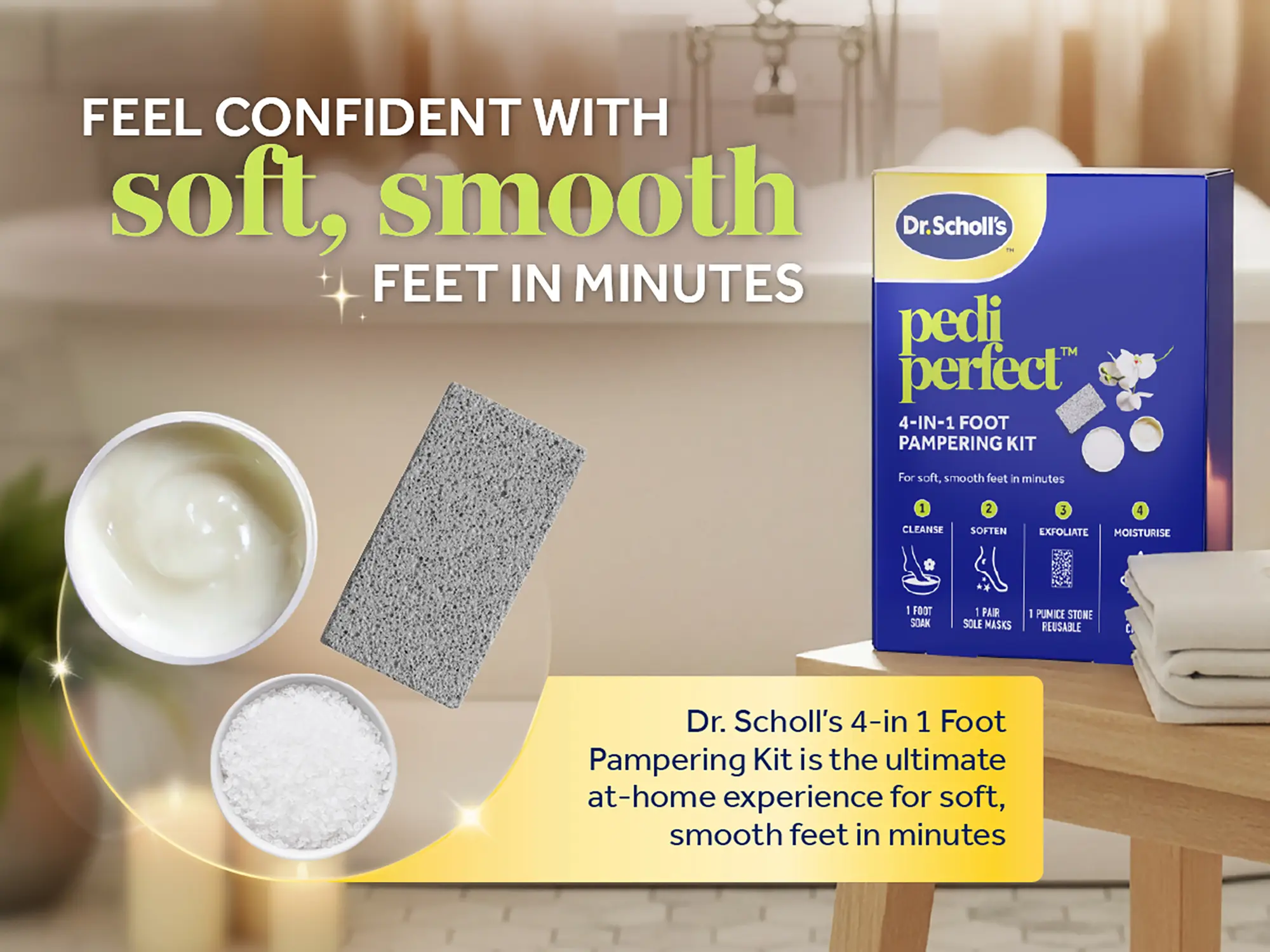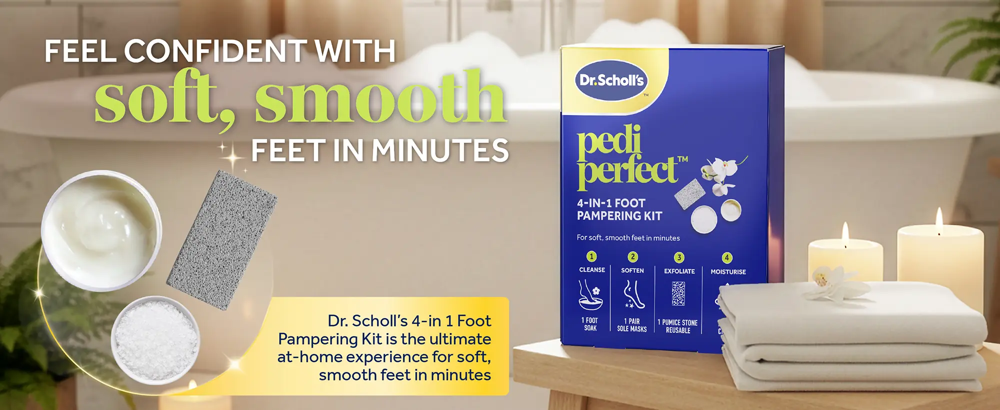 SOFT, SMOOTH FEET IN MINUTES: Dr. Scholl’s Pedi Perfect 4-in-1 Pampering Kit helps you feel confident with soft, smooth feet in minutes using a simple routine designed to treat your feet with the ultimate foot care kit