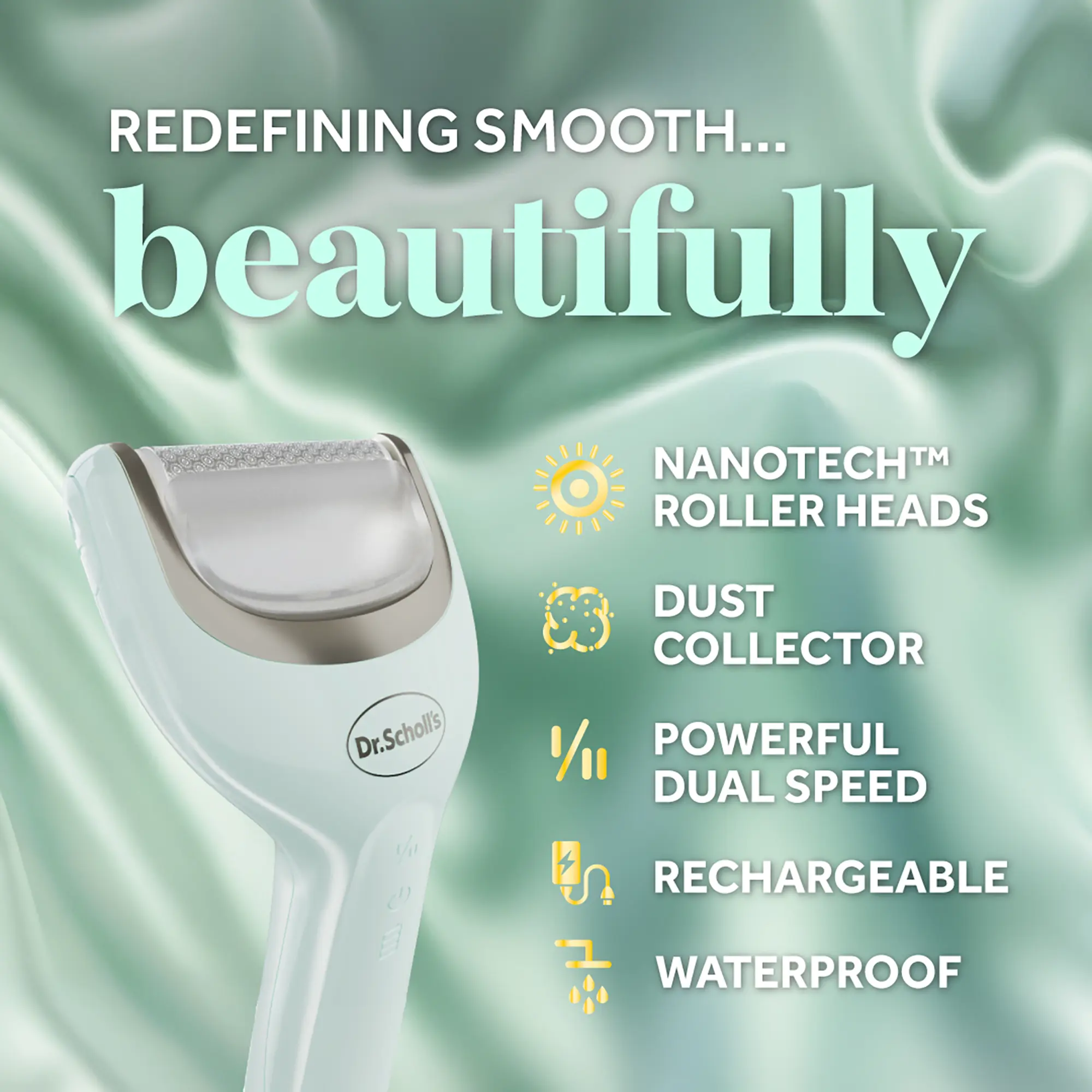 Experience salon-style smoothness at home with Dr. Scholl’s Pedi Perfect Pro Electronic Foot File. This waterproof, rechargeable device gently buffs away hard, rough, and dry skin to reveal softer, more beautiful-looking feet after every use. NanoTech Roller Heads with multi-directional micro-grinding points deliver fast, even results, featuring an ultra roller head for the toughest skin, a fine roller head that smooths and polishes, and a contoured roller head designed to target heels. The powerful dual-speed motor lets you customize your exfoliation, offering gentle smoothing or more intense buffing where you need it most, supported by Pressure Lock Technology for safe dead-skin removal. With up to 90 minutes of run time and an LED battery indicator, it’s built for convenience and control. The patent-pending dust catcher helps keep your routine under control, while the waterproof design allows use on wet or dry skin. Bring the salon experience home with effortless, effective foot care every time.