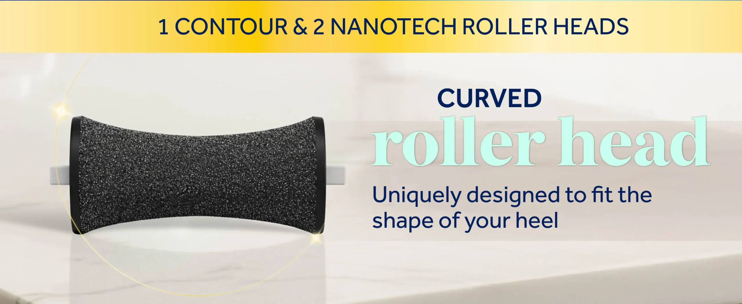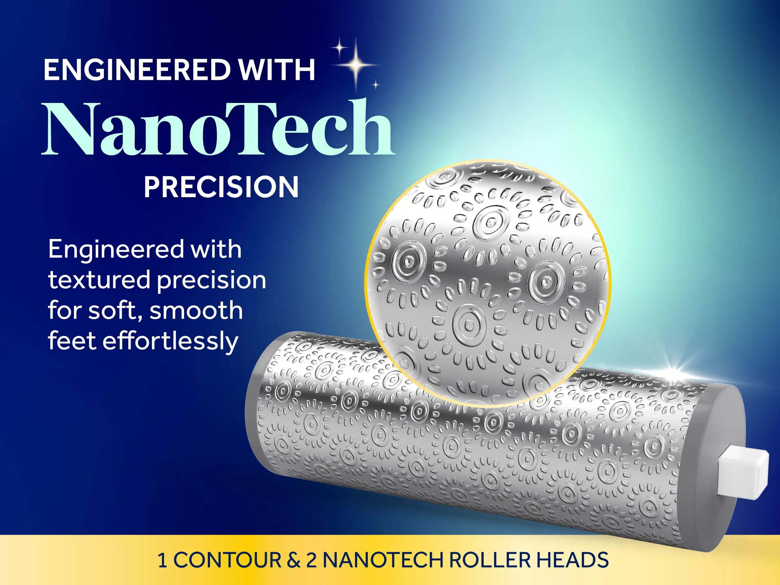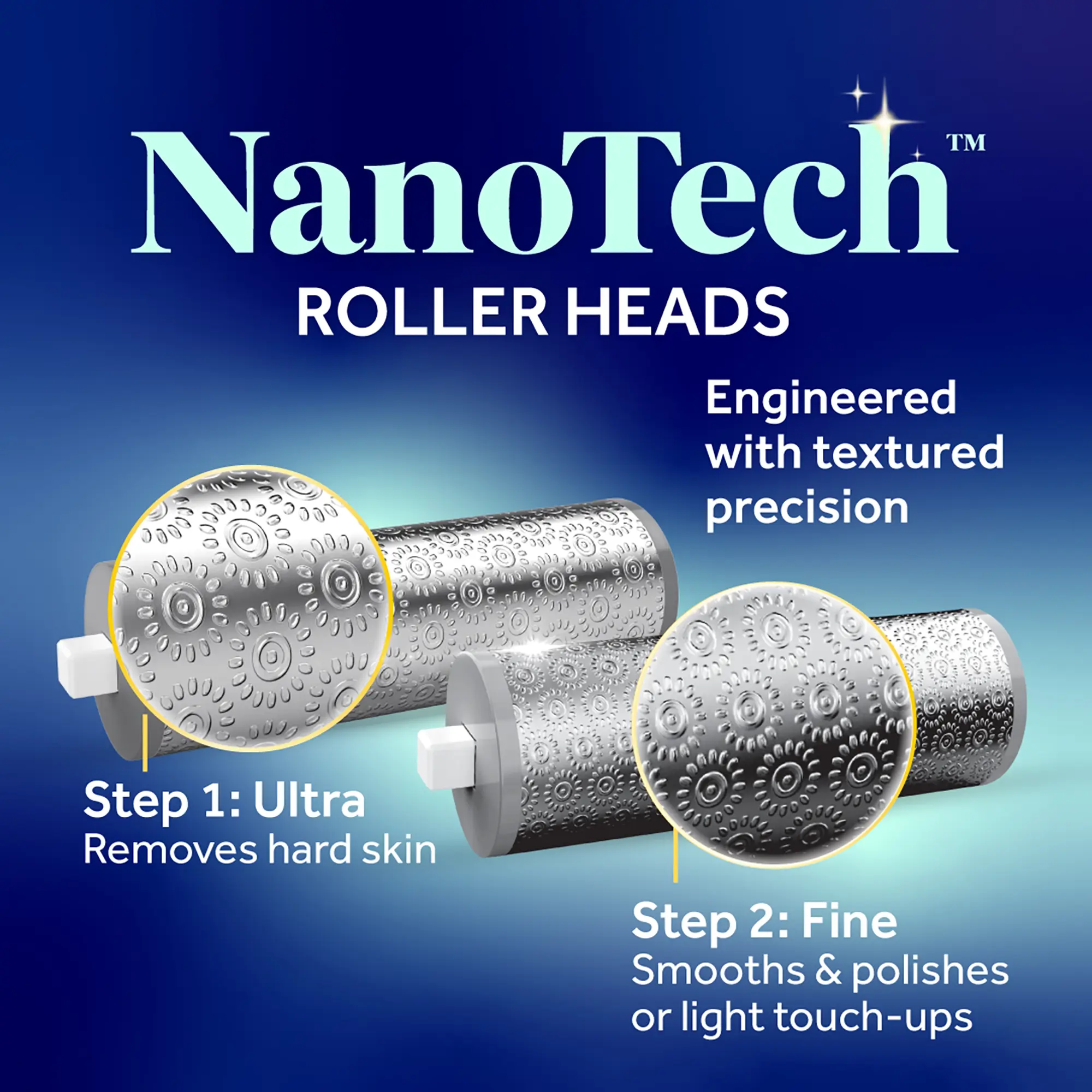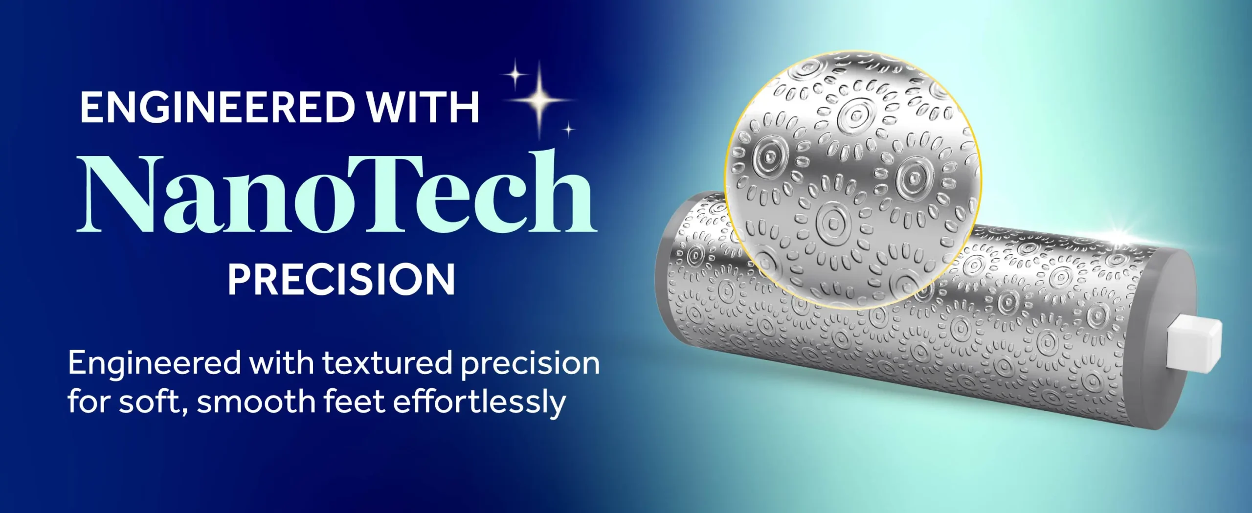 NANOTECH ROLLER HEADS: Innovative textured rollers with multi-directional micro-grinding points effectively file and smooth callused skin at the same time, with an ultra roller head that removes the hardest skin, a fine roller head that smoothes and polishes, and a contoured roller head that targets heels to deliver fast, even results that leave feet feeling beautifully smooth
