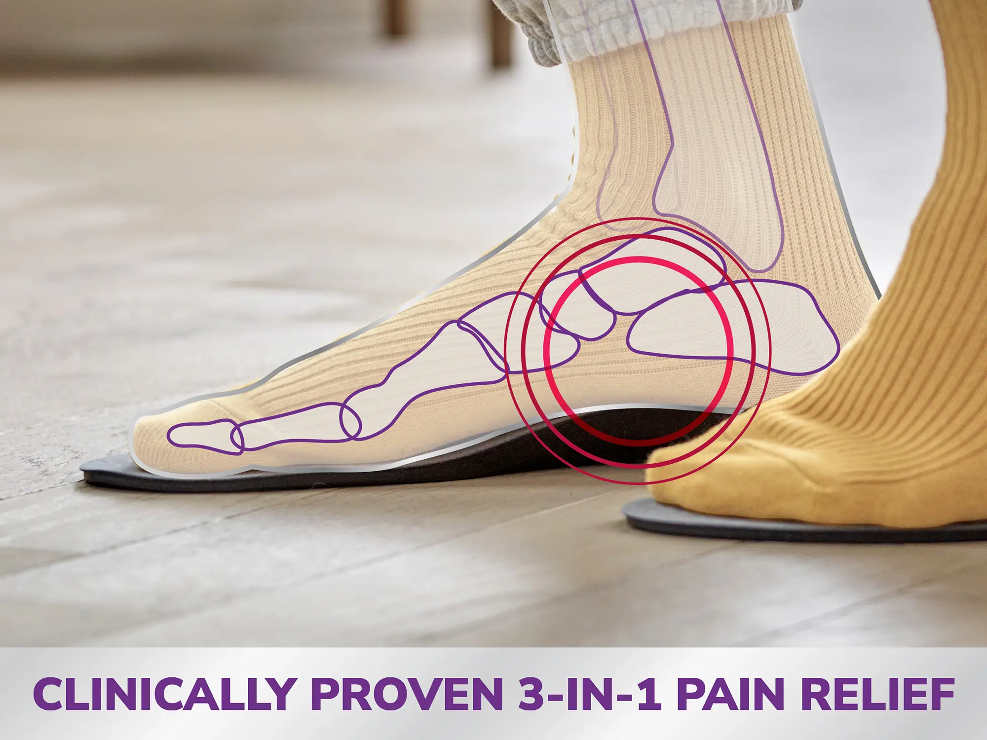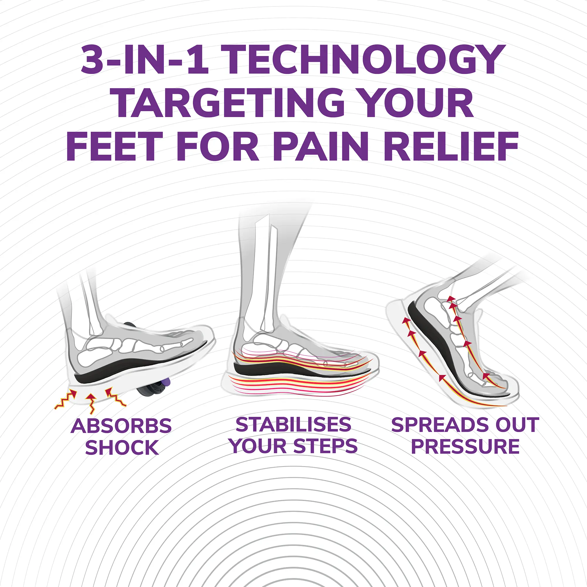 CONTINUOUS PRESSURE RELIEF: Every step you take puts pressure on your feet. Our clinically proven 3in1 action of shock absorption, stabilisation and pressure redistribution effectively tackle the Plantar Fasciitis pressure.