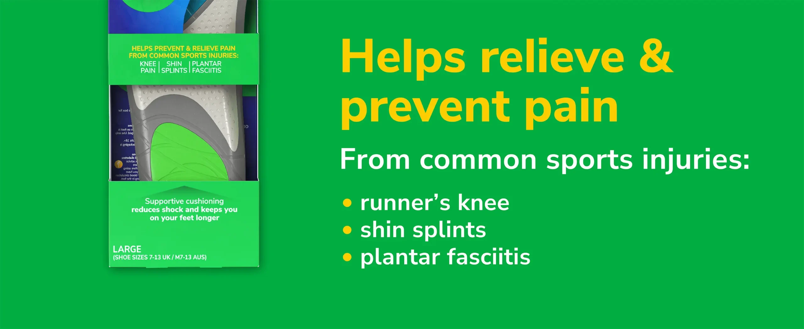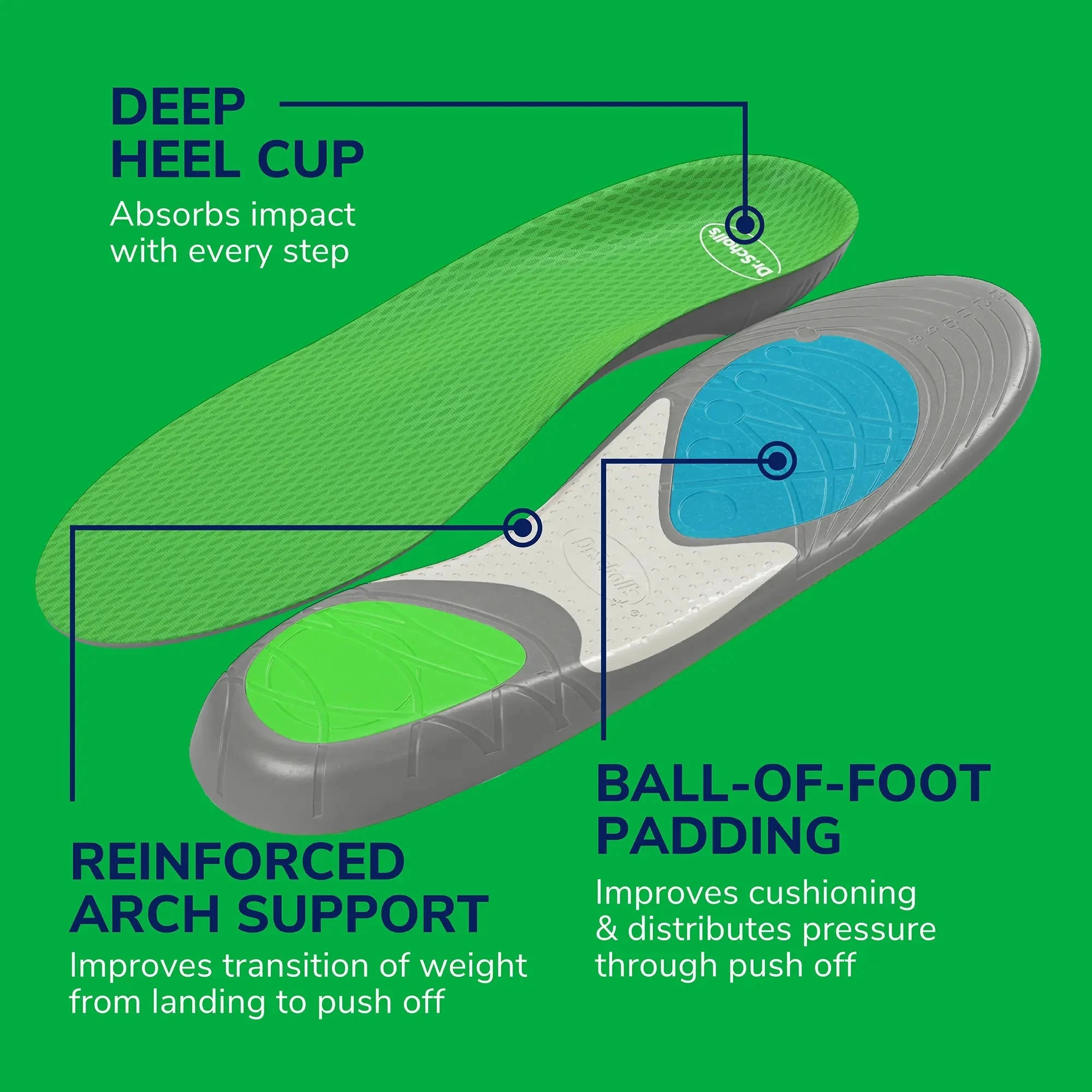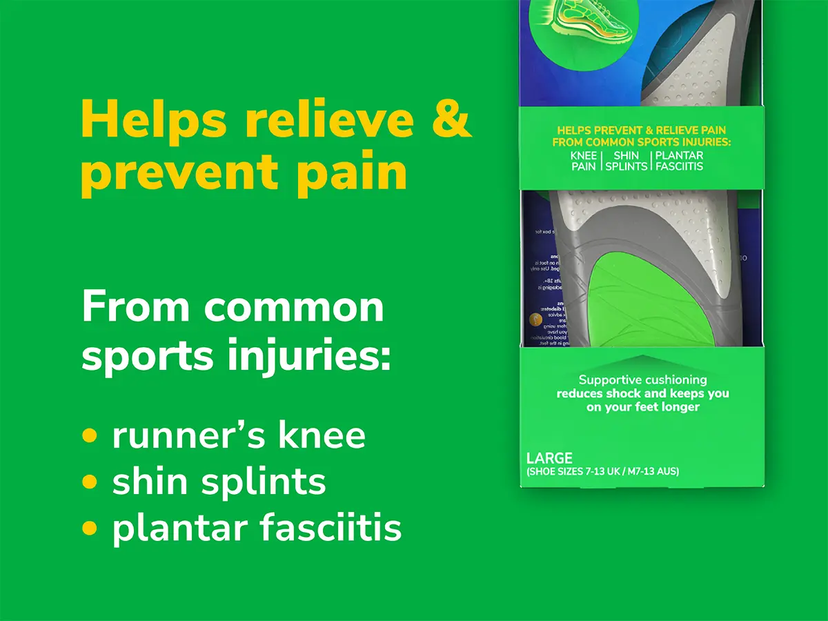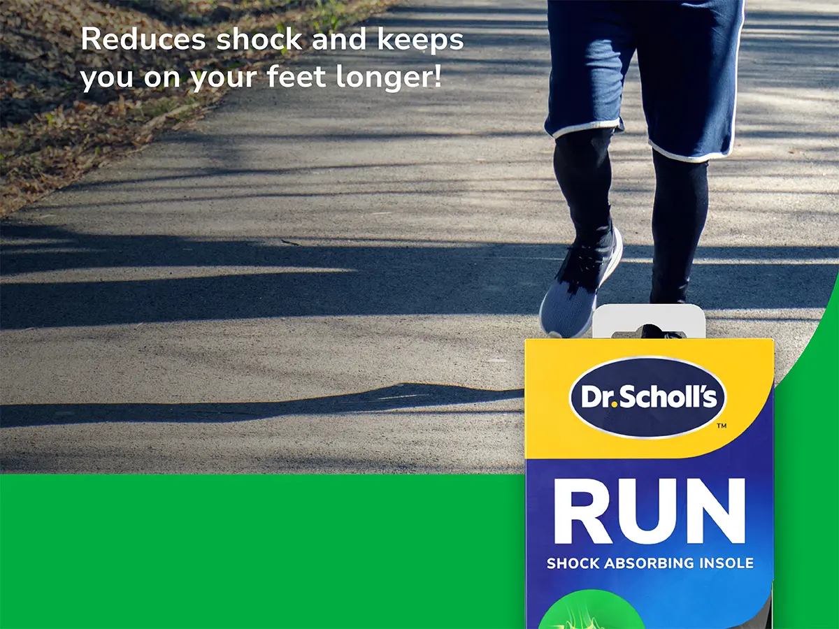 HELP TO RELIEVE PAIN FROM COMMON SPORTS INJURIES: Dr. Scholl’s Run Shock Absorbing Insoles help alleviate pain from common running injuries, including runner’s knee, shin splints, and plantar fasciitis, keeping you comfortable on the move